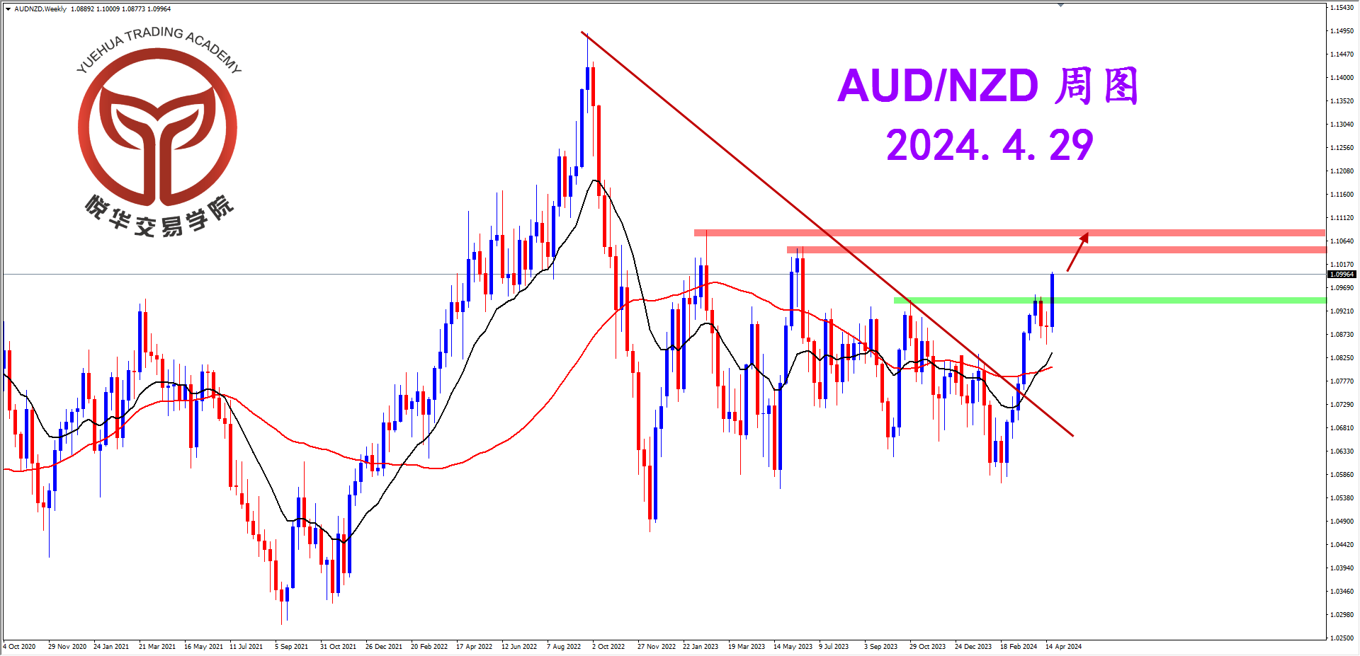 澳纽周图,上周行情收出一根坚决大阳线,突破并且站稳上了1.0950的水平压力位置,结束了调整并且重启多头方向,本周建议密切关注所有合理的多头形态,目标位置先看1.1053-1.1083一带。