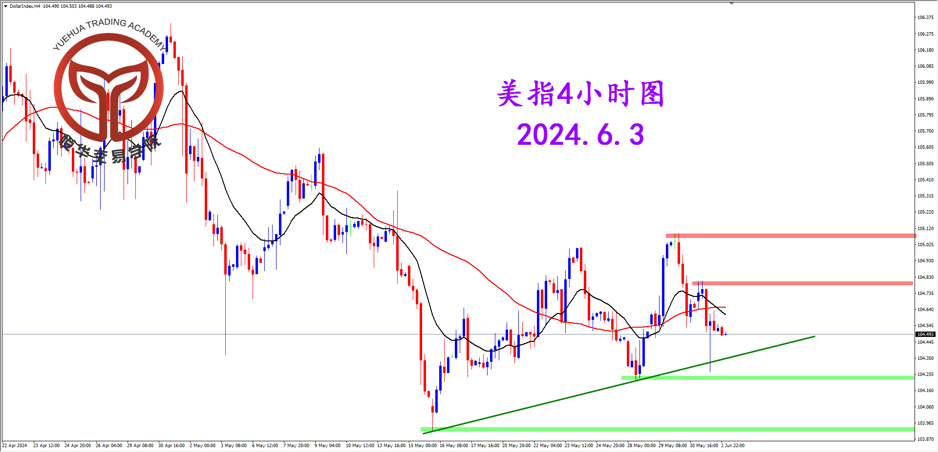 美指4小时图,行情触及到支撑线后快速反弹,预示下方支撑作用明显,结合大周期考虑到综合判断目前美指只是在震荡调整,所以超短线交易难度较大,尽量观望为主。