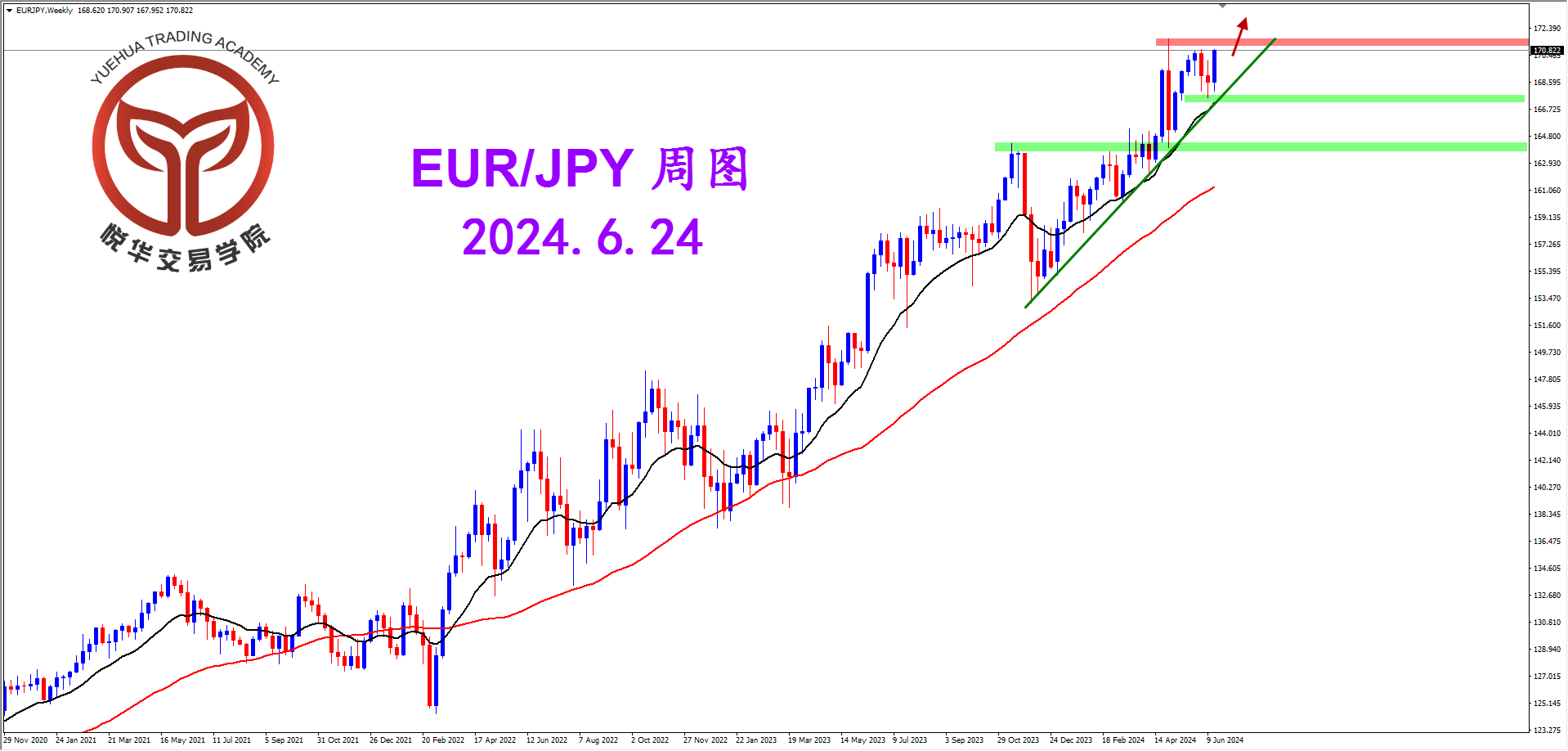 欧日周图,上周行情收出坚决阳线,有进一步向上拉升机会,甚至有突破高点压制的潜力,短线内关注多头机会,并且关注171.60一带的压制作用,突破后持有多单。