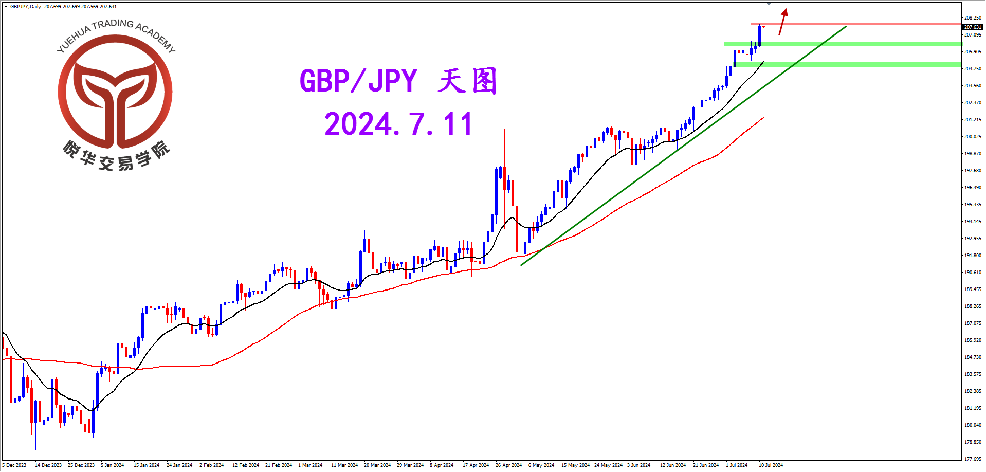 镑日天图,昨天行情收出坚决阳线,幅度虽然不大但也超越了之前的各种不确定的蜡烛形态,预示调整有结束表现,后市有可能凭借该阳线继续走强,密切关注可能的短期调整充分后的合理机会。