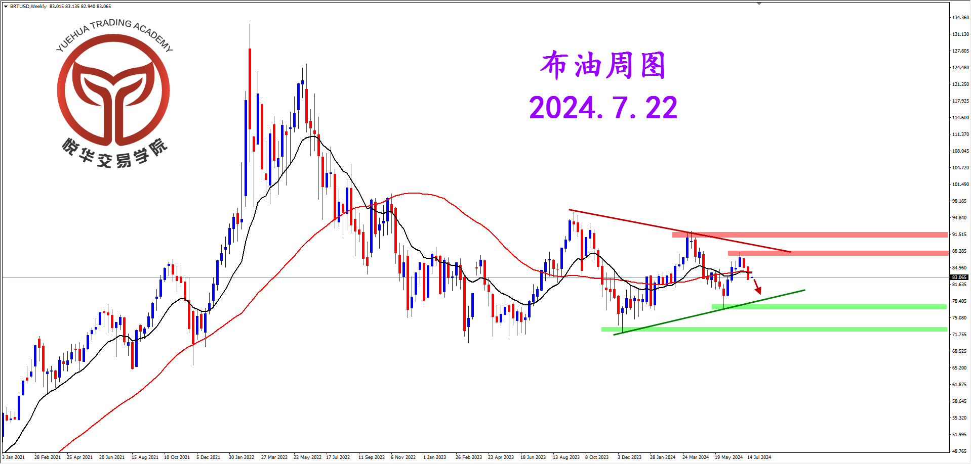 布油周图,上周行情收出阴线形态,虽然还没有在周线级别显现大跌动作但天图级别的表现很弱,至少从天图坚决阴线看空头占据主导,有继续走弱的机会。
