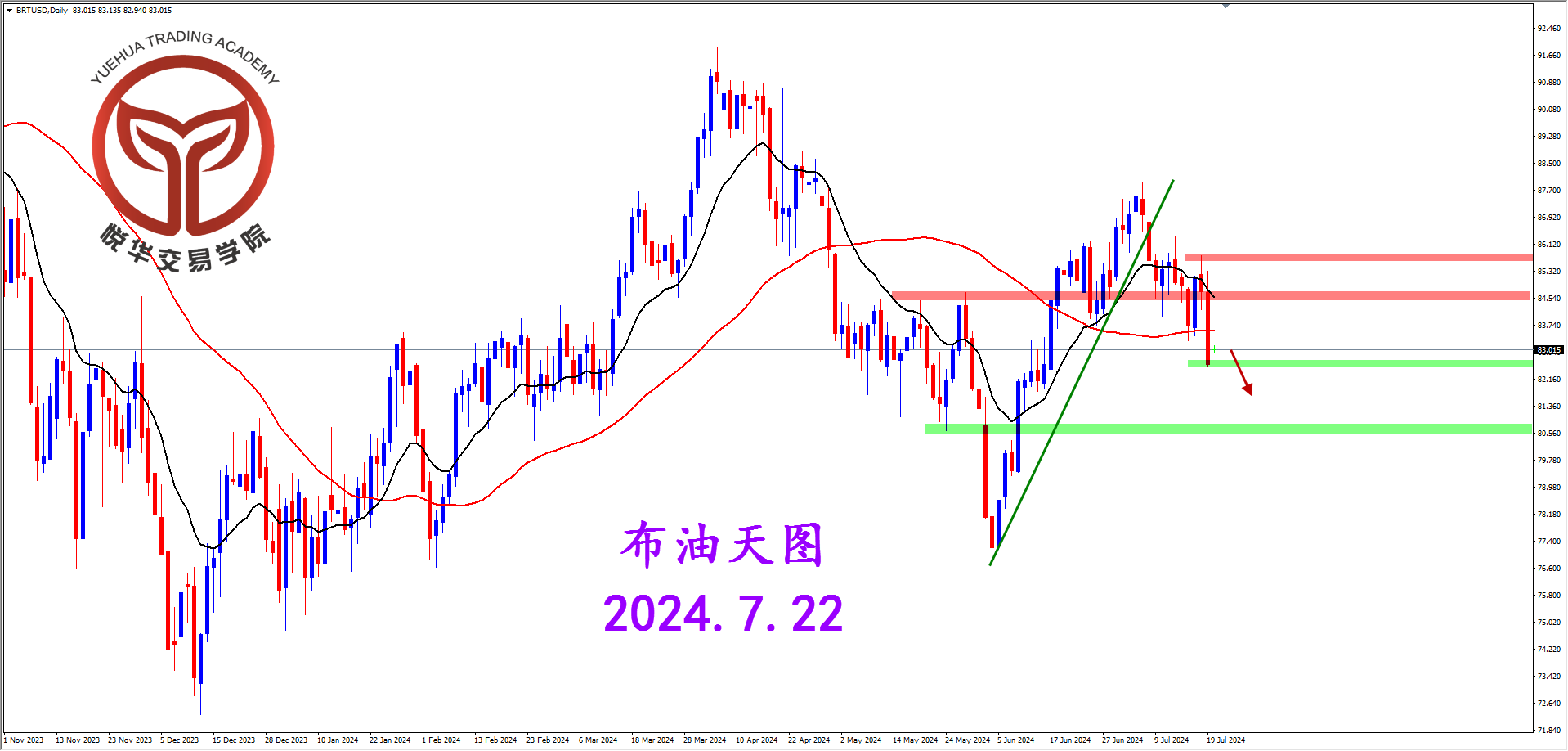 布油天图,上周五晚盘行情开始大幅走弱并且下跌情绪非常浓烈,不但收出坚决阴线,并且跌破了关键支撑,奠定了后市空头格局方向,后市密切关注充分调整后的空头形态。