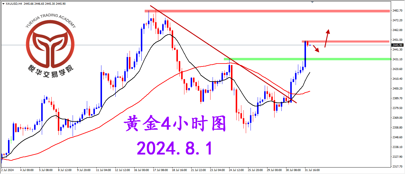 现货黄金4小时图,行情突破压力线后一鼓作气直接突破了2431.8的压制作用,目前多头表现强劲,有望再接再厉继续拉升冲击高点,关注合理的介入形态。