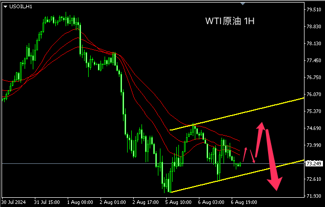 原油从日线图级别看,中期走势反复震荡逐步走低,且油价跌破均线系统的支撑,原油上周受到重创持续下落,油价即将测试中期区间下沿支撑72.60位置,预计中期不跌破支撑位前,仍维持区间内震荡格局。
