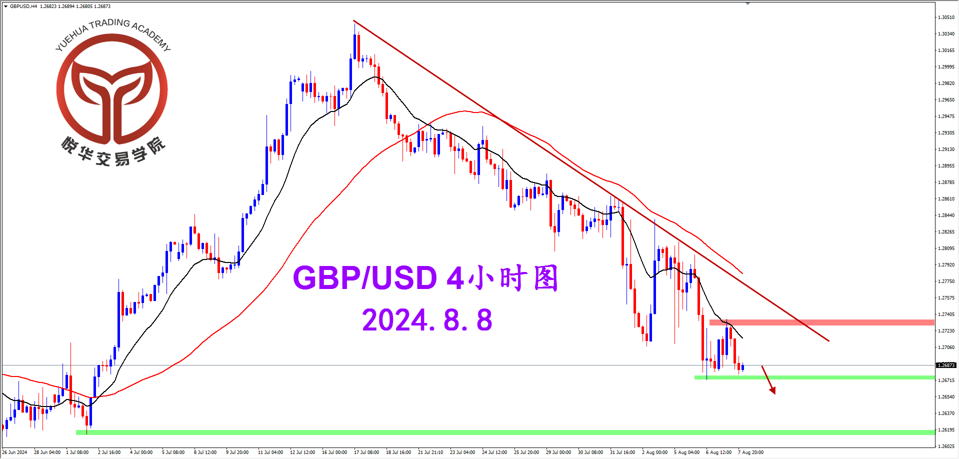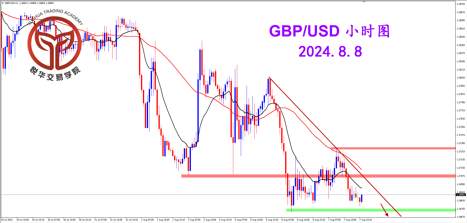 镑美小时图,行情经过复杂的调整后遇阻走弱,但由于起跌点较高所以行情没有直接破位,目前正在进行支撑附近的调整,关注可能的破位空头机会,尽量等待坚决阴线有效跌破后关注。