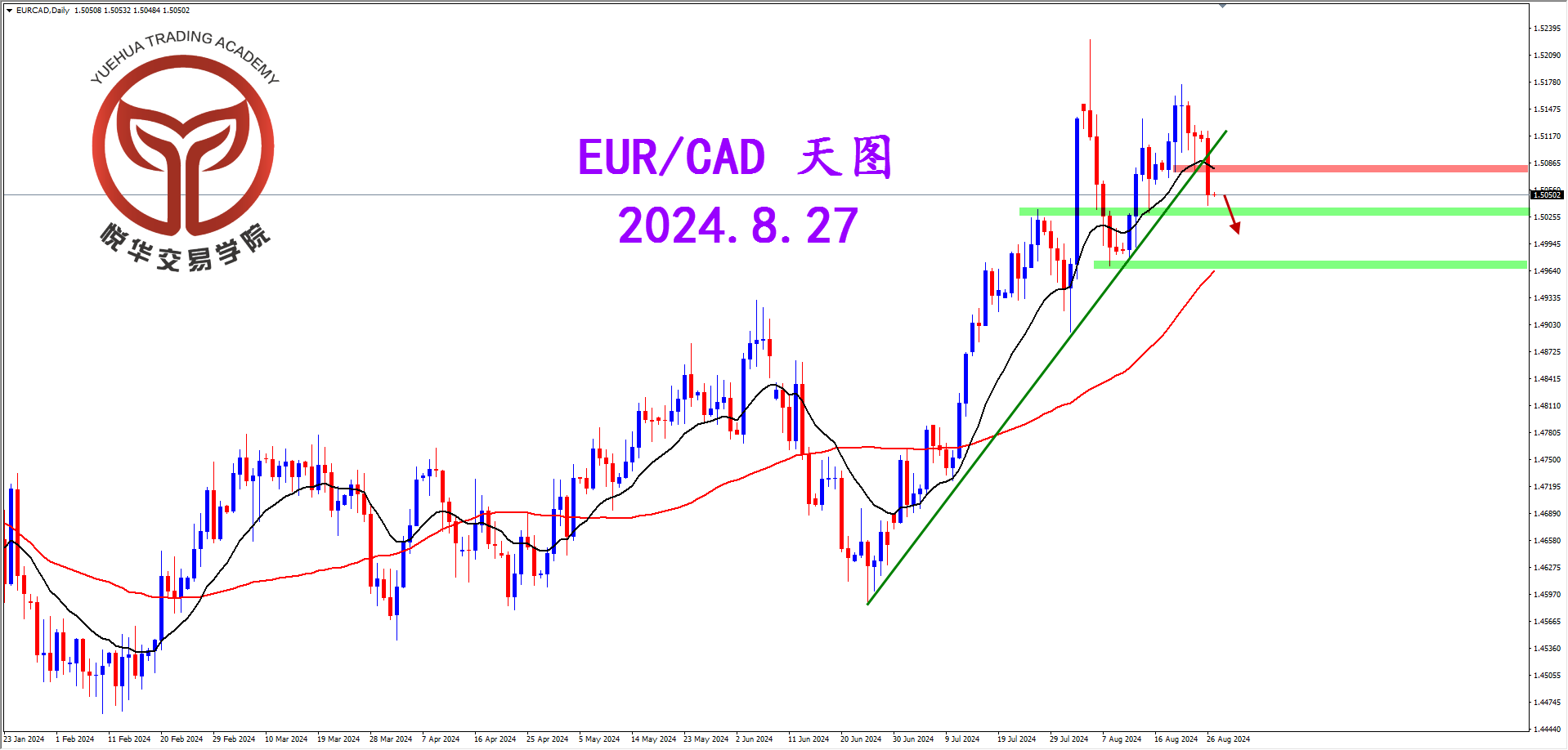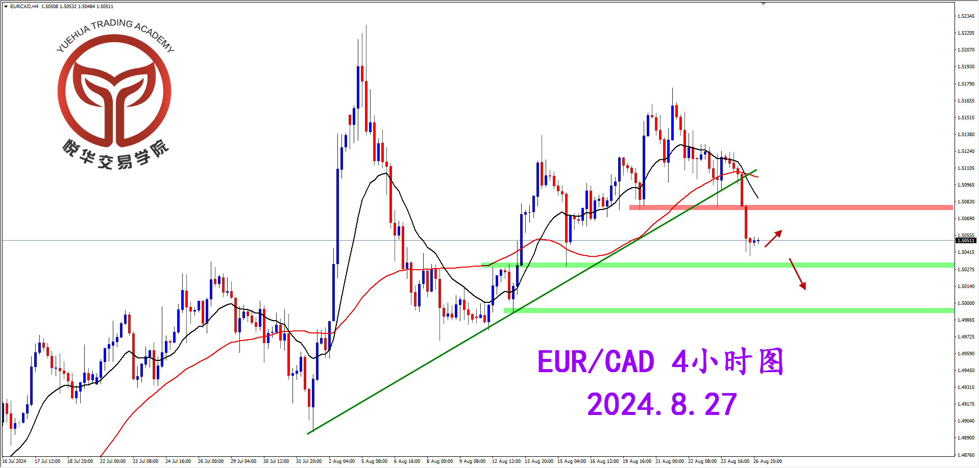 欧加天图,昨天行情收出坚决大阴线,跌破了上升趋势线改变了多头趋势方向,后市有望转市向下运行,密切关注水平支撑的得失和表现,关注可能的空头机会。