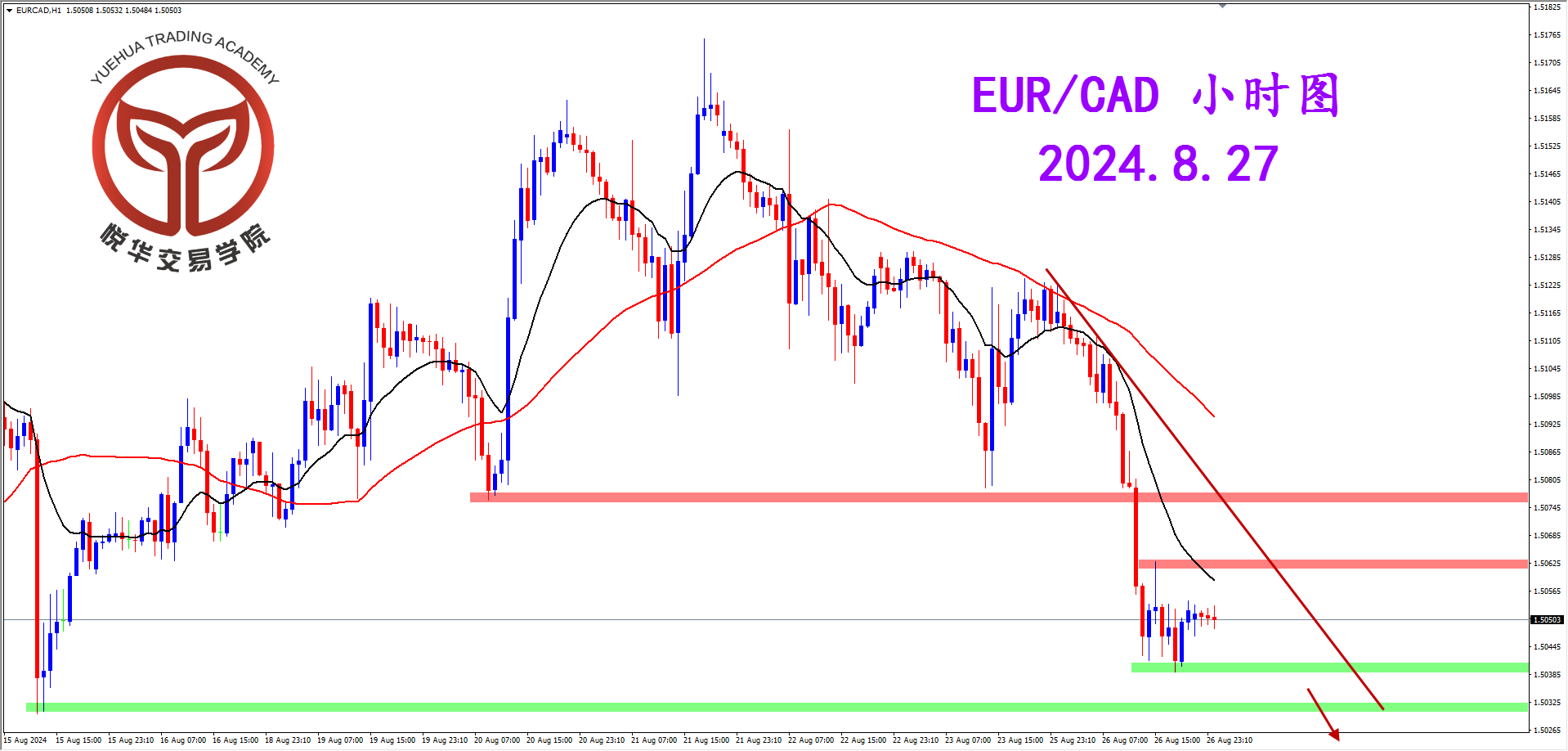 欧加小时图,目前行情处于一波下跌后的调整阶段,均线空头排列有利空头发展,等待调整结束后凭借均线压制和更加重要的蜡烛形态,关注可能的继续空头机会。