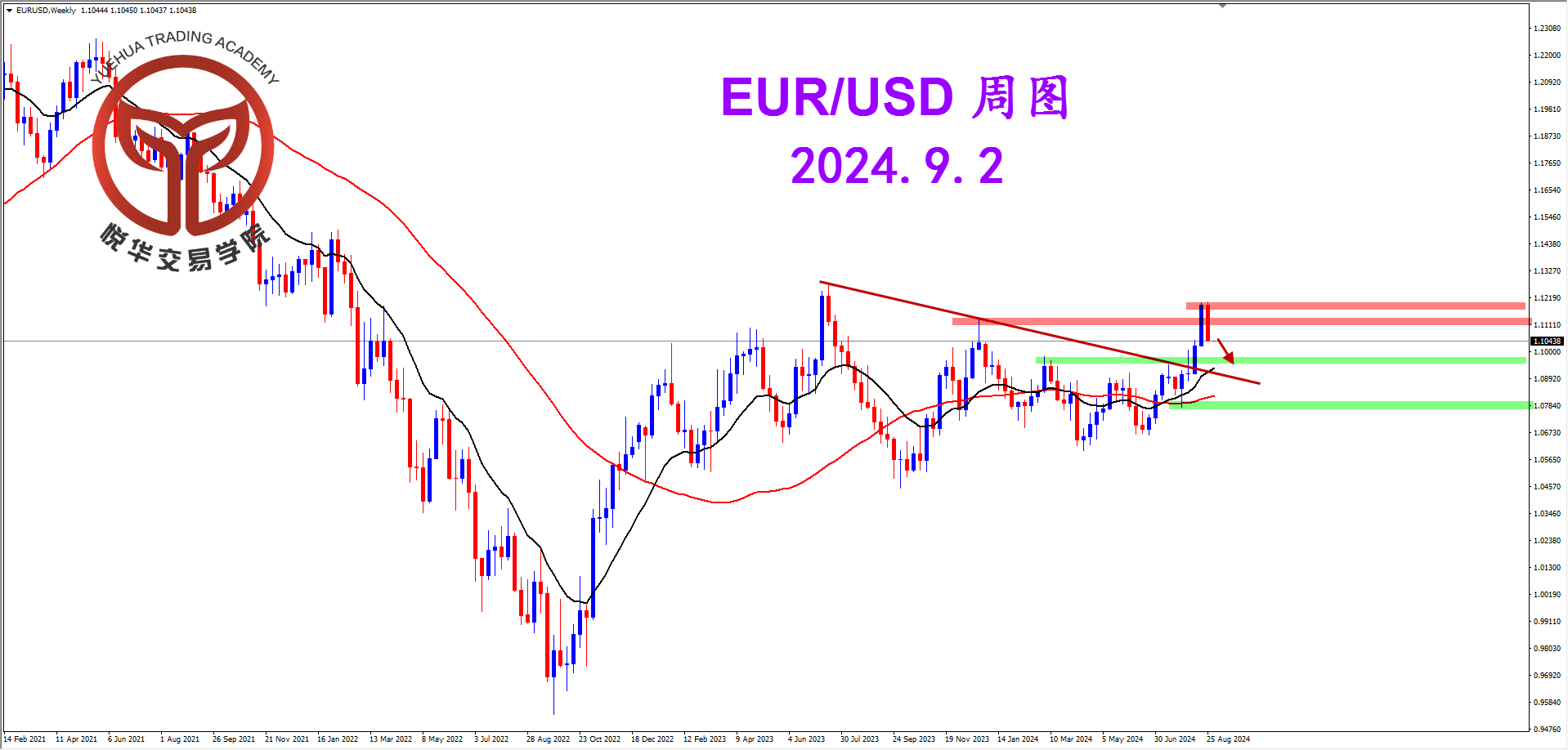 欧美周图,上周行情收出一段不小的阴线,没有承接上周坚决大阳线而继续拉升,目前价格再度跌回到了1.1135支撑下方,连续的下跌预示空头占据主导,但毕竟已经连续多日走弱所以再空需谨慎。
