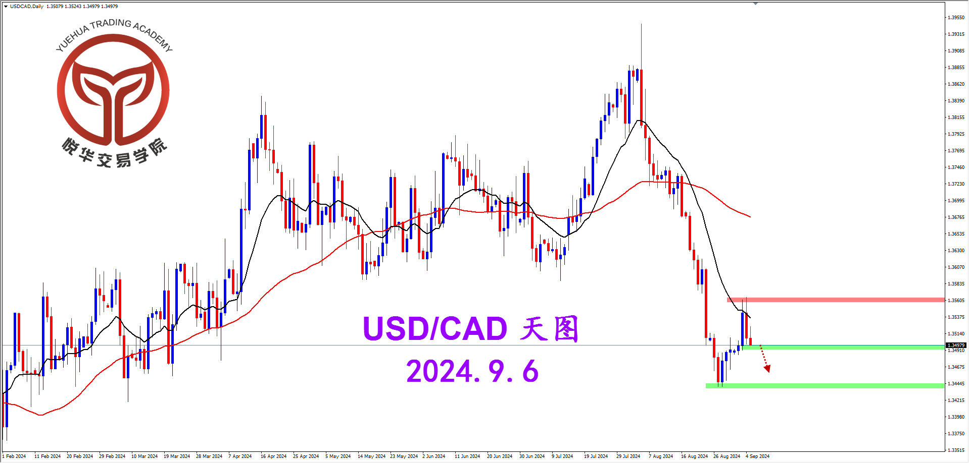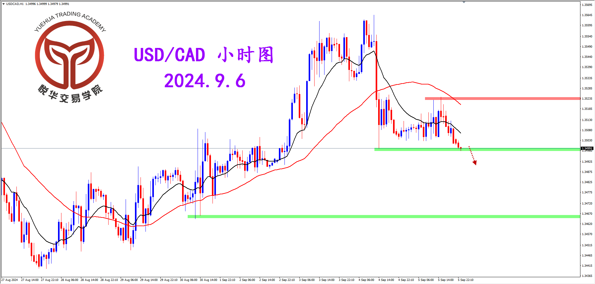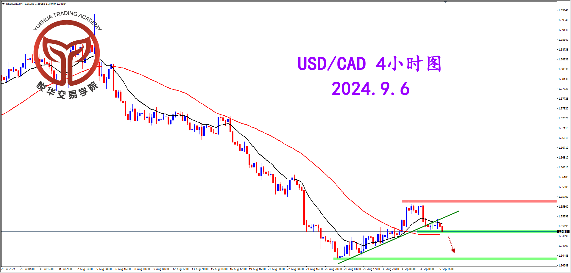 美加4小时图,回调形成的支撑线有被跌破的表现,只是力道不坚决,目前在新的1.3498支撑附近进行调整,如能坚决跌破才有下滑走弱一段的可能。