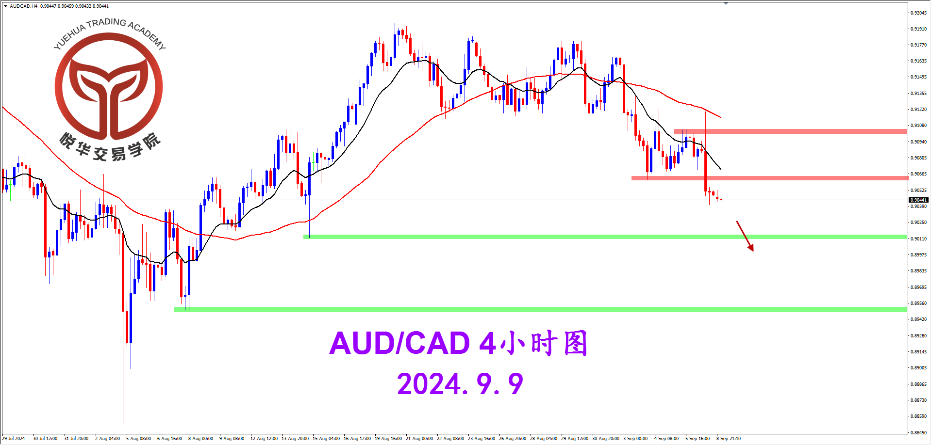 澳加4小时图,目前的形态走势属于空头占据主导,从跌破0.9066后按正常发展逻辑判断行情只有一个空头方向可以运行,除非出现极端反弹,否则只关注短期级别的高概率的做空形态。