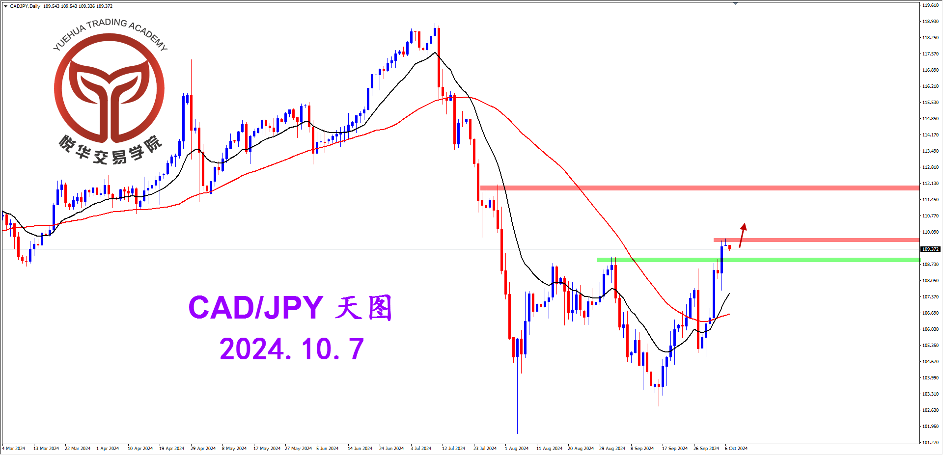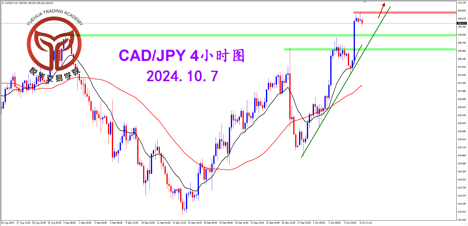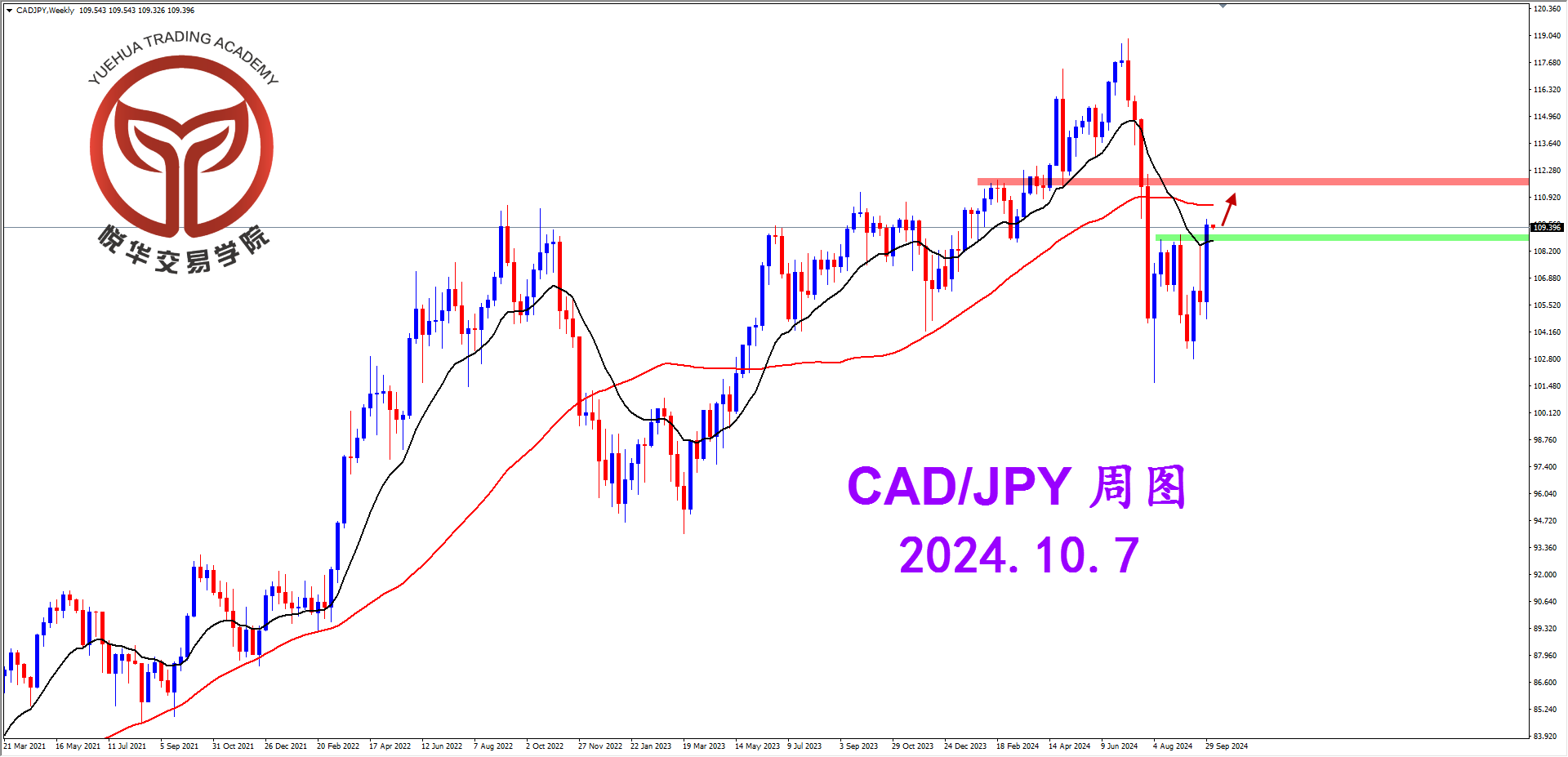 目前加日的总体格局方向属于多头,技术形态上从周图以及天图的阳线可以明确判断,只要行情不跌回天图109.06一带的支撑,都要保持多头思路,后市行情大概率是要继续拉升,投资者寻求短期充分调整后的高概率多头机会形态就好。