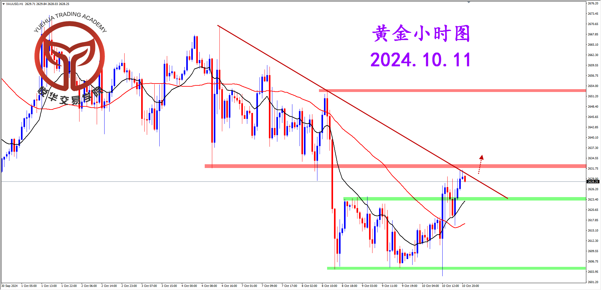 现货黄金小时图,行情极端探底拉升后目前遇阻关键压力线附近下方,均线开始转为多头排列,但多头需要坚决突破上方压制,否则不要过分乐观短多,最好是等到自行突破后关注短多形态。