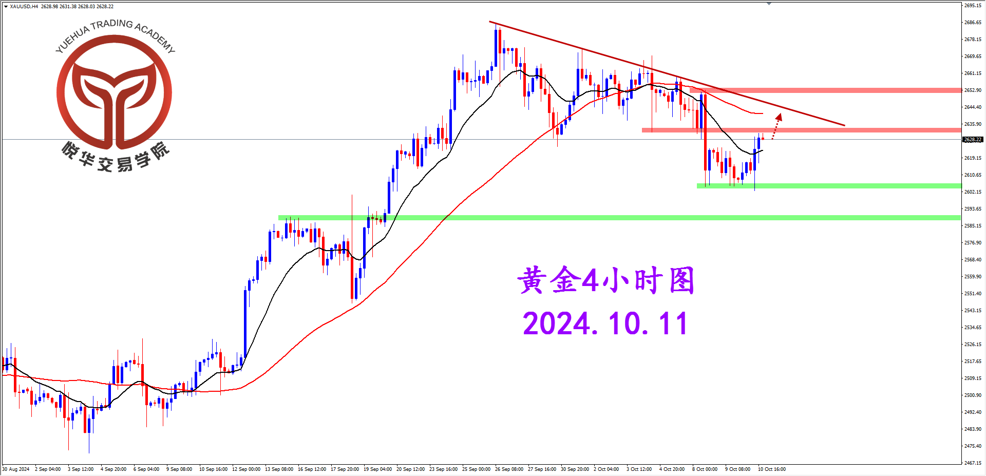 现货黄金4小时图,行情横盘震荡调整,昨晚凭借数据企稳向上拉升,目前暂时遇阻2631.5的水平压力位置,并且有突破的潜力,密切关注短期形态,但不要追多价格。
