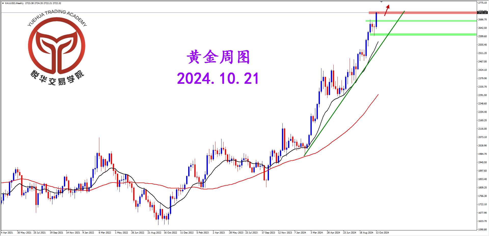 现货黄金周图,上周行情报收坚决阳线,这根阳线幅度大且再度开启了新一轮的拉升行情,在现有技术形态下不要臆测做空,只关注顺势的多头方向就好,如手中有多单的可以持有让利润奔跑。