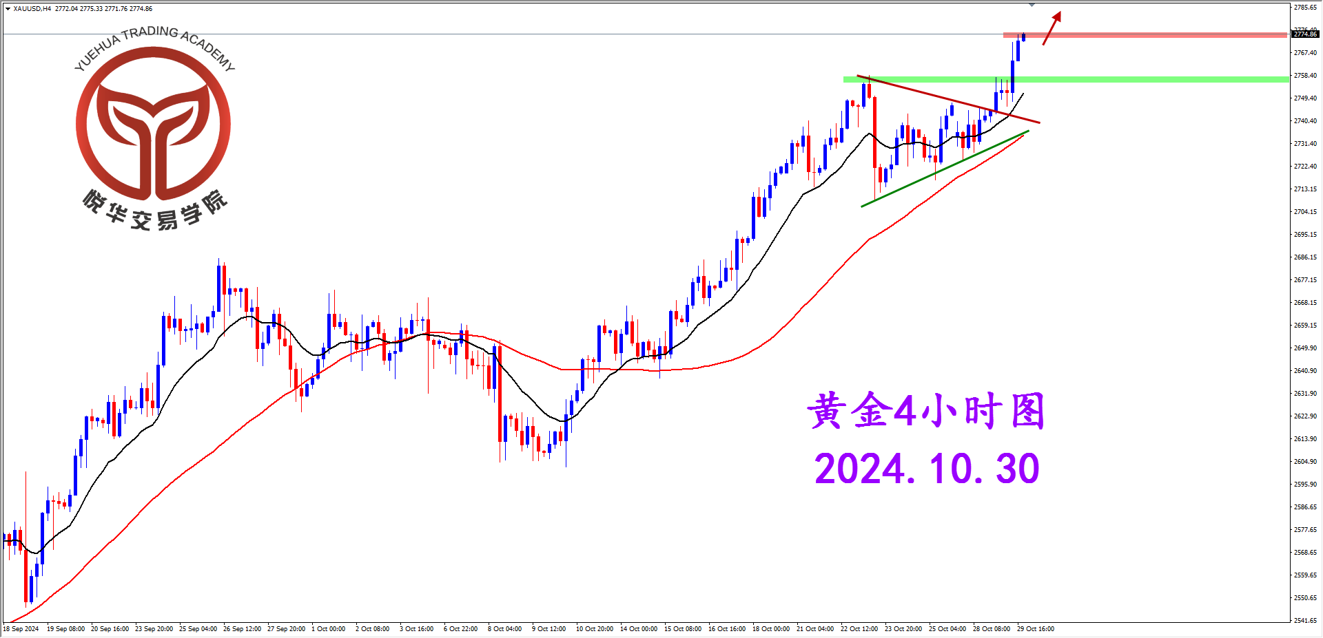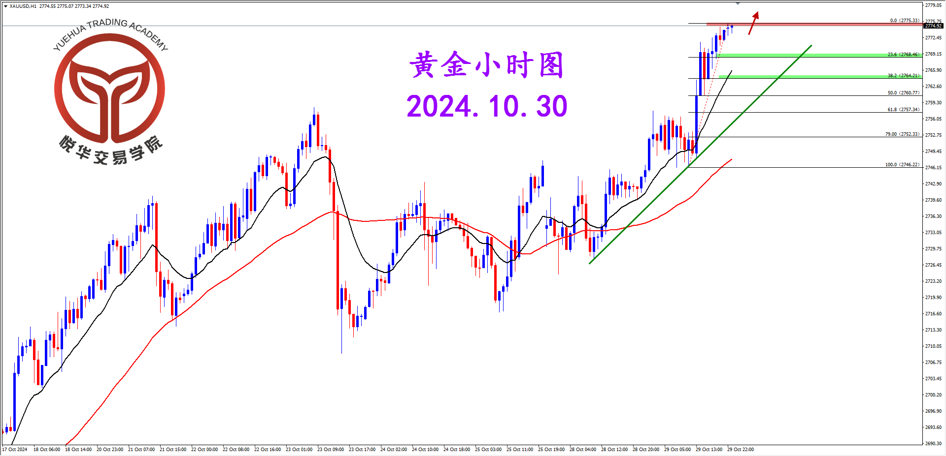 现货黄金小时图,行情在2757.5的水平压制下方进行了充分调整,并且形态也相当合理,破位过程中入场做多,目前多单持续获利,并且日内如果有合理形态可以继续做多。