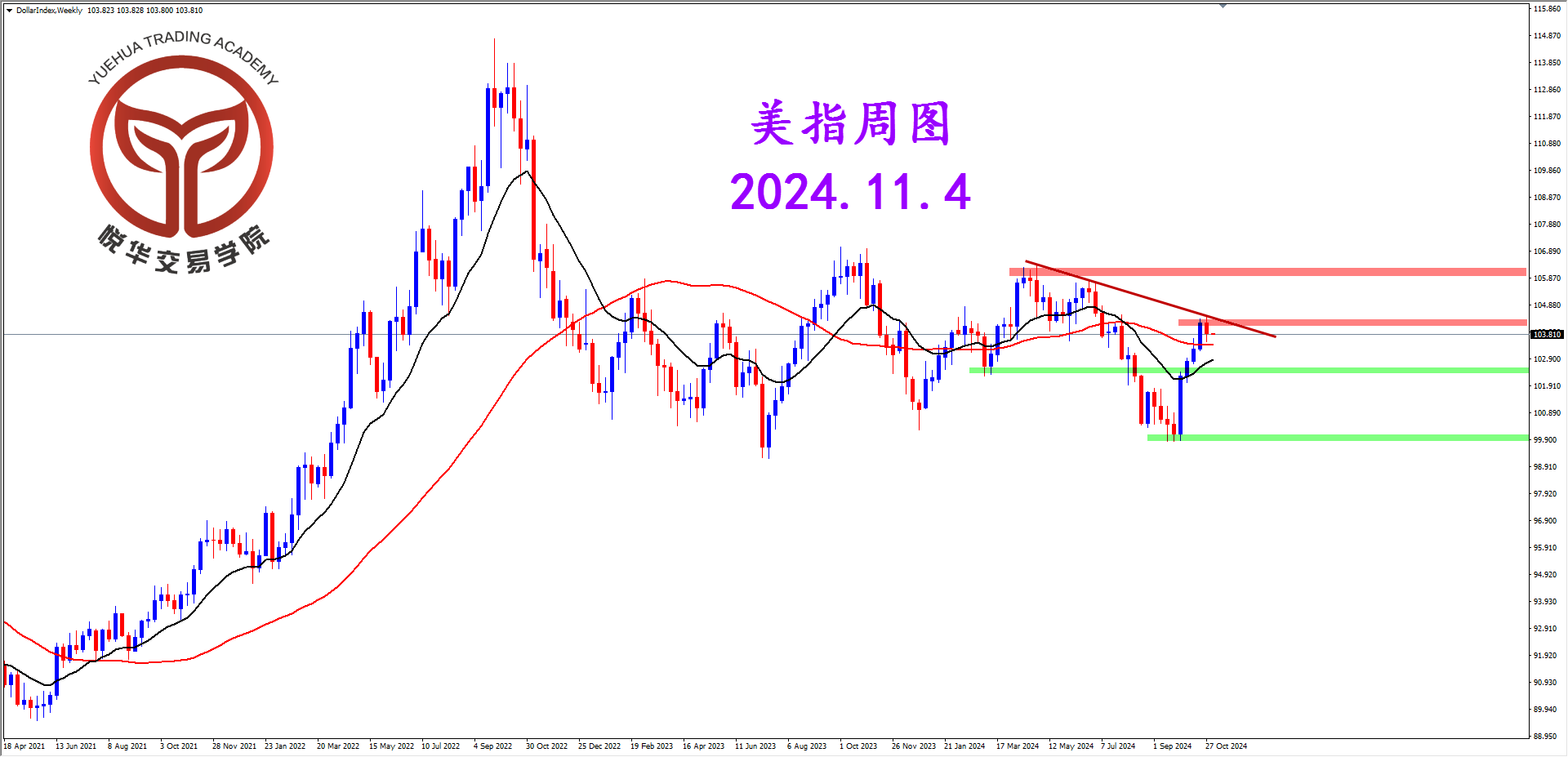 美指周图,上周行情在拐点压力线附近遇阻后震荡调整,加之之前的行情多头释放充分,在关键压力附近势必要进行争夺,注意行情短期调整节奏,等待调整结束方向明朗后关注合理机会。