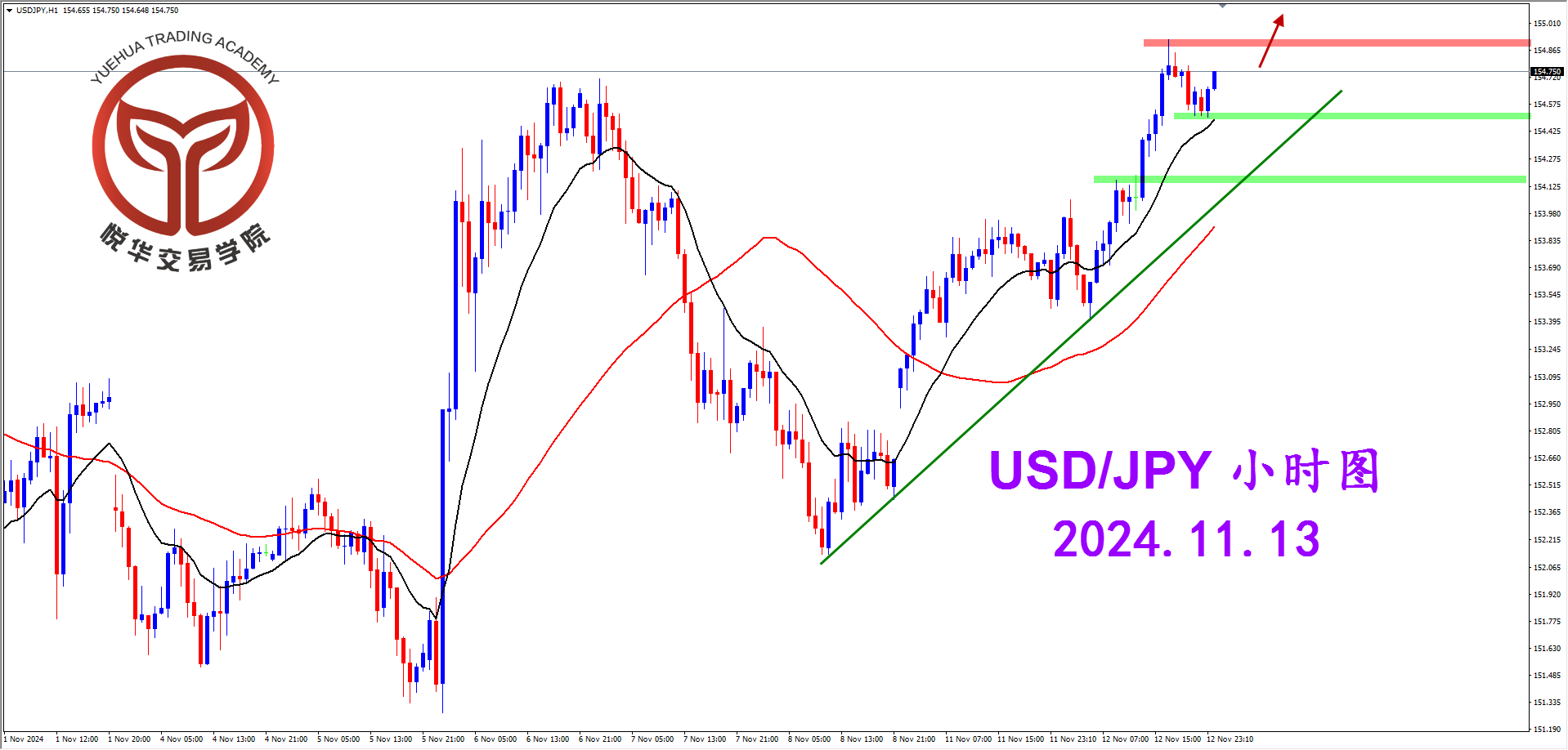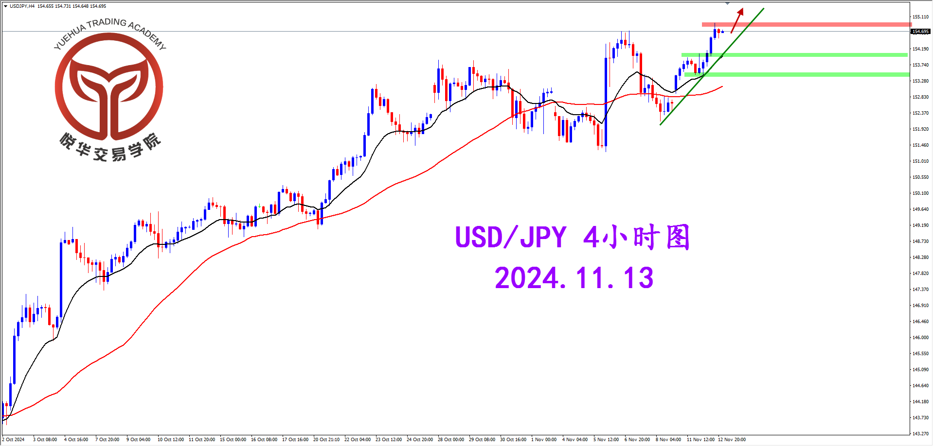 美日4小时图,行情一波小幅拉升向上运行,目前没有直接突破关键压制而是暂时遇阻于154.70-155.12的压制附近,看看后市经过调整后能否直接突破大幅拉升。