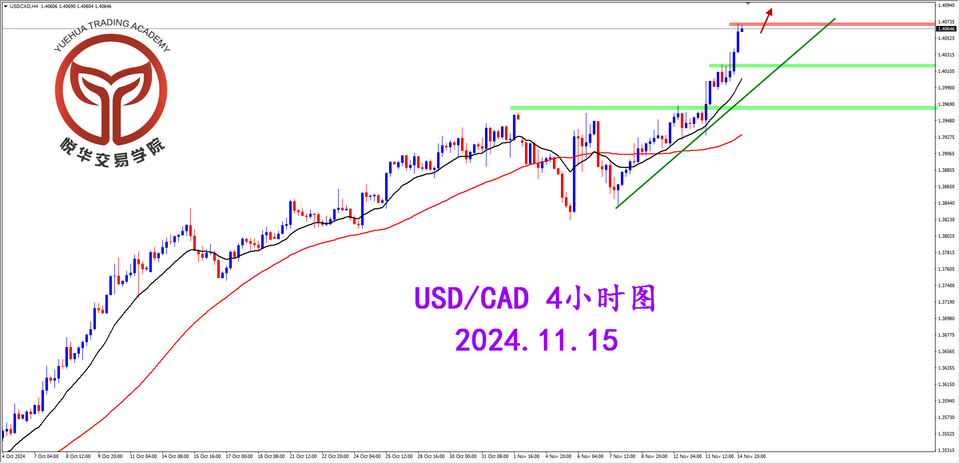 美加4小时图,行情之前凭借数据影响而诱空后破位1.3967后一路向上,目前坚决阳线显示多头主导方向,调整后有望继续拉升,只是多头表现极端需要有短期调整形态配合。