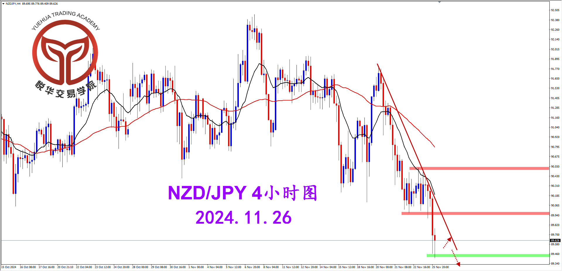 纽日4小时图,行情经过密集且复杂的调整后坚决跌破短期支撑,目前价格走弱明显,只是天图阴线幅度不大日内空头还存在风险,只能寻求短期合理形态,否则不要勉强追空。
