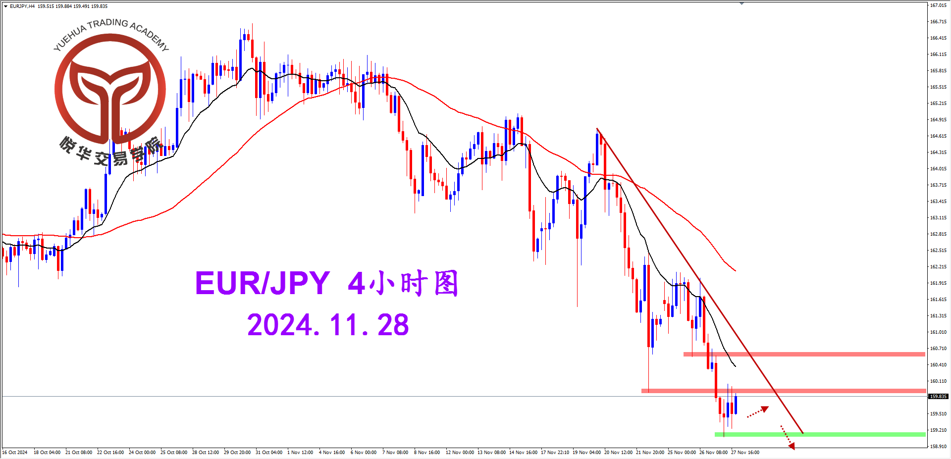 欧日4小时图,行情大幅震荡调整后从高位一路下跌走弱,跌破159.95一带支撑后目前进行了回测压制作用,目前的市场流向和运行仍然保持利空发展,后市凭借压制作用关注遇阻走弱的可能。