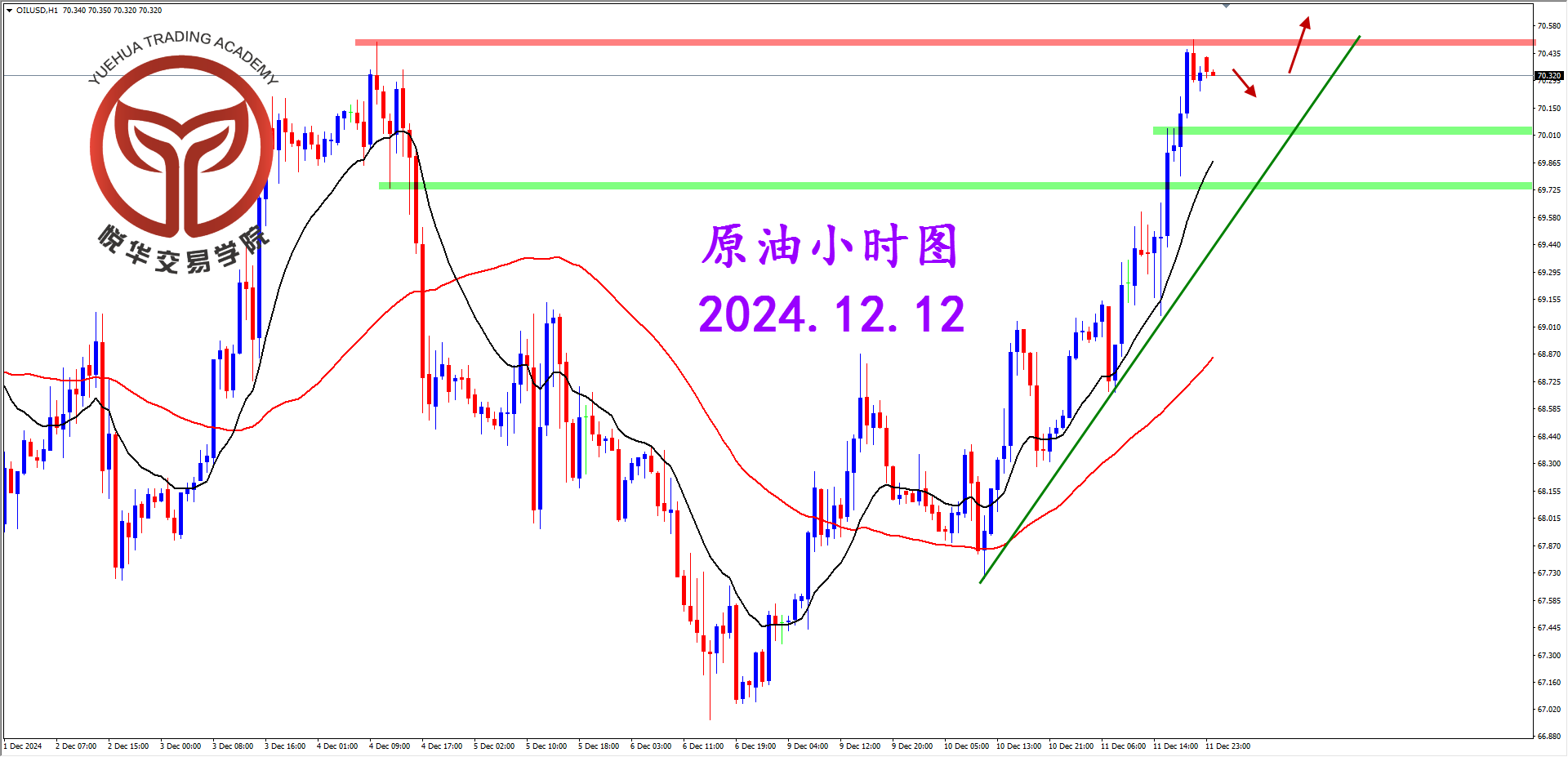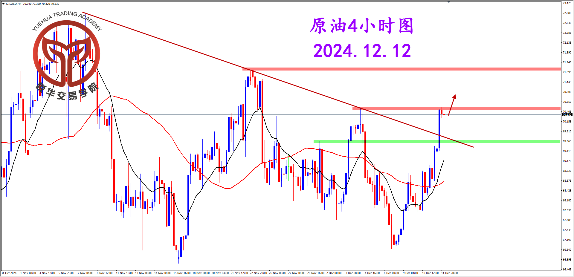 原油4小时图,这波多头拉升的幅度较大,目前处于70.50的水平压力位置附件,阳线表现强势,调整充分后有望继续向上运行,密切关注合理多头形态。