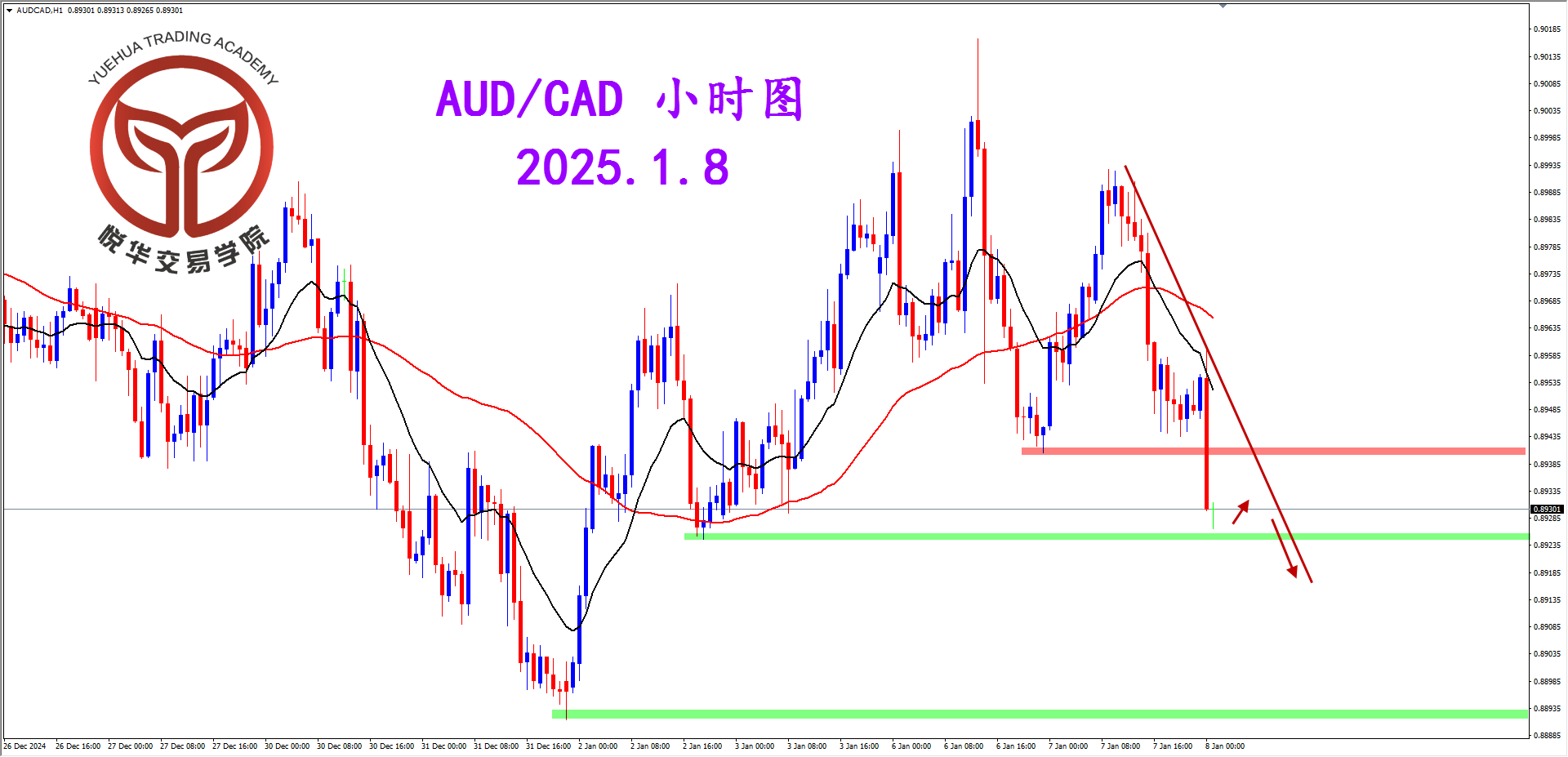 澳加小时图,坚决阴线奠定短线空头基调,密切关注支撑位置附近的调整过程,关注合理的空头形态,但如果直接破位不建议追空,只能耐心观察。
