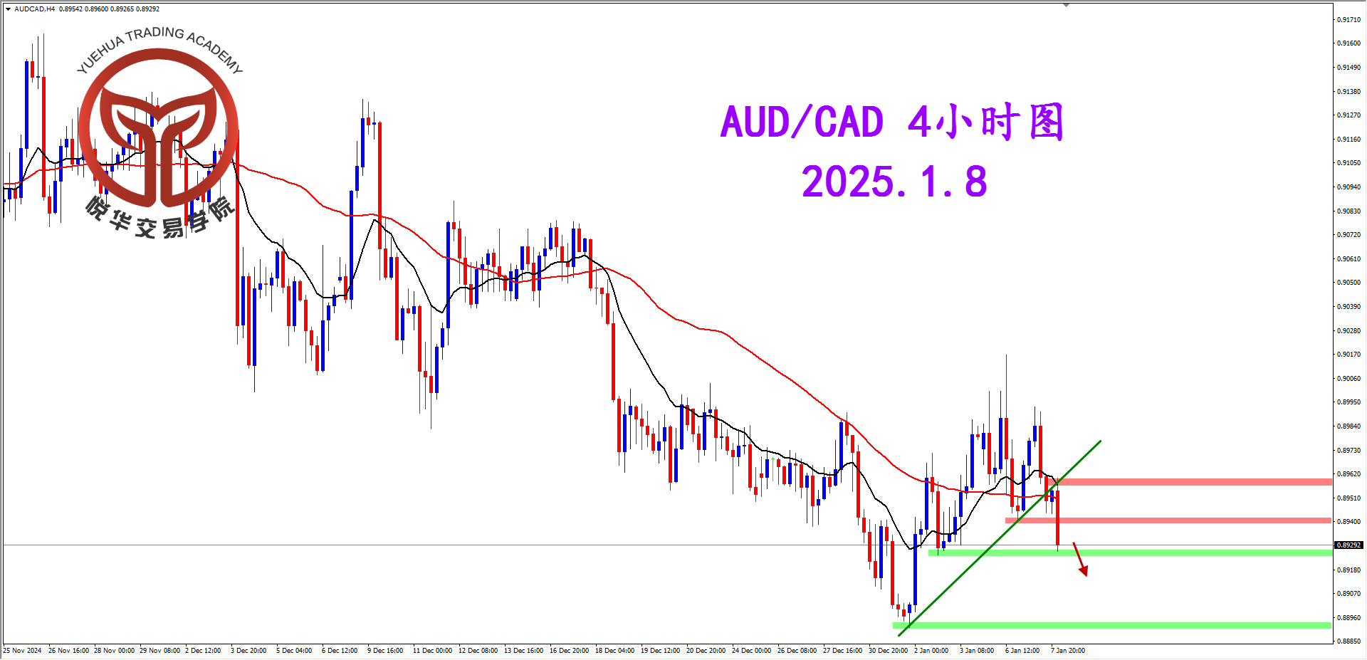 澳加4小时图,支撑线被坚决跌破,空头有望形成短期之势,密切关注调整后的合理空头形态,只是如果极端直接走弱尽量不要追空。