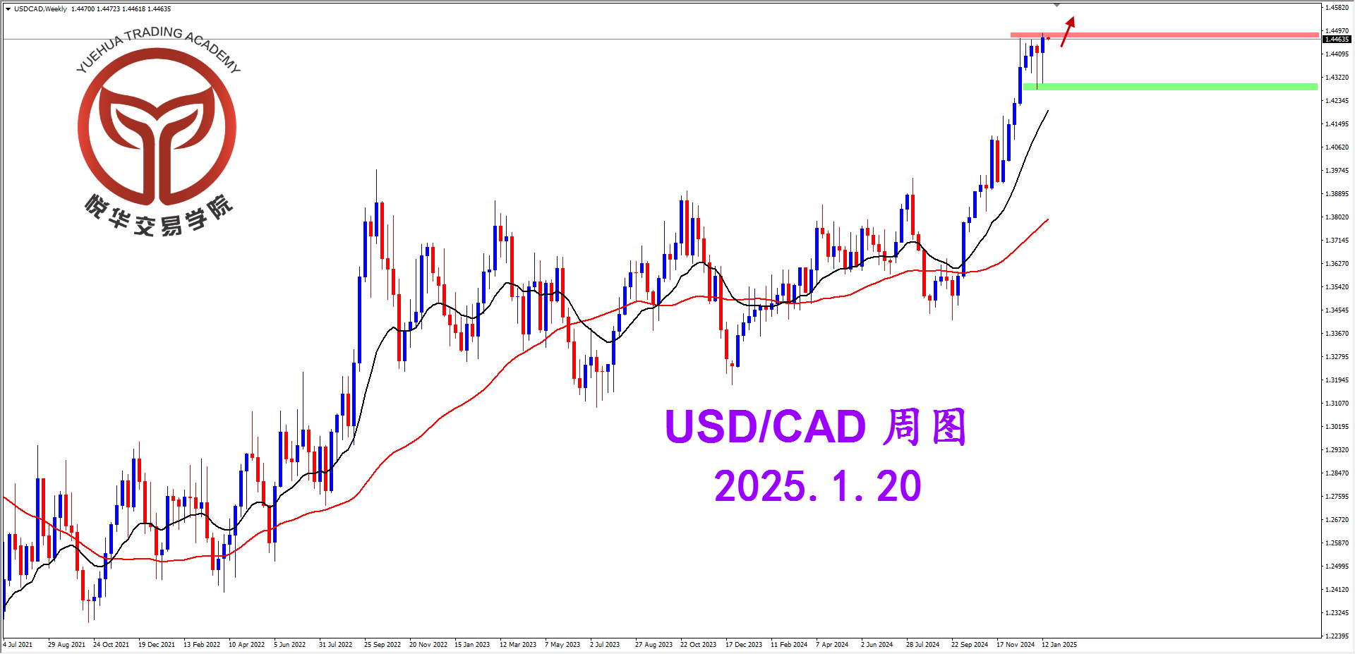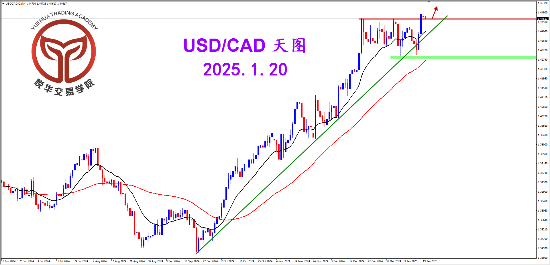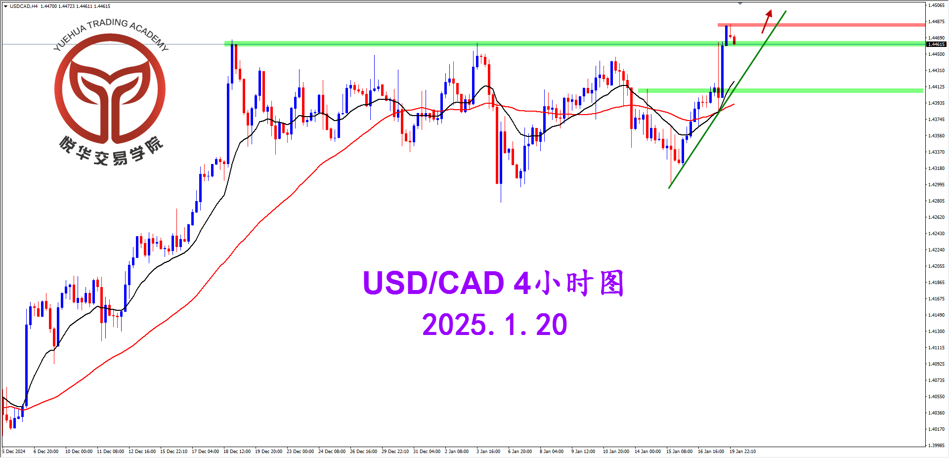 美加4小时图,行情第一波冲击1.4462后大幅回落,但下根K线再度强势拉升并且持续走强突破高点,多头情绪占据上风,等待短期充分调整后的高概率多头形态。
