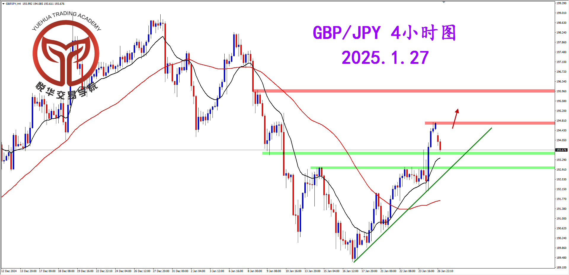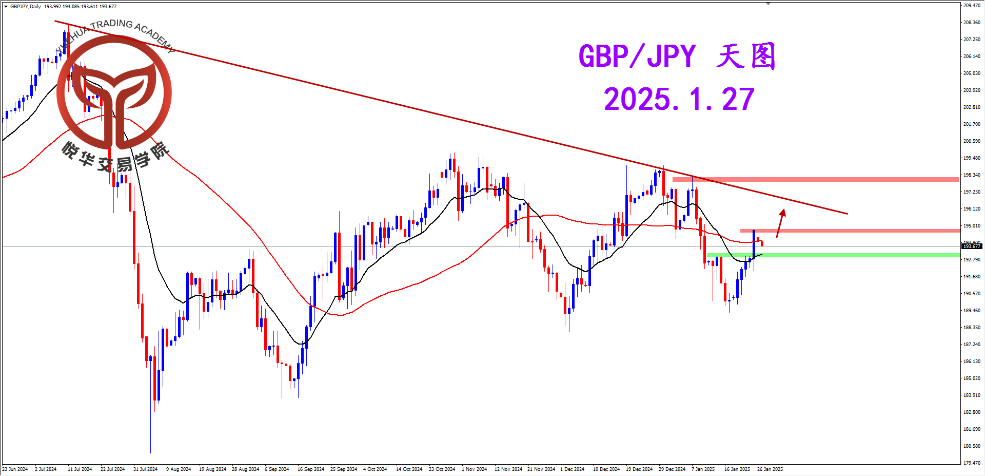 镑日天图,行情一路向上运行,在周五的波动表现强势,坚决阳线突破194.28的水平压力位置,多头方向较为明确,目前行情正在回调,待调整结束关注多头机会。