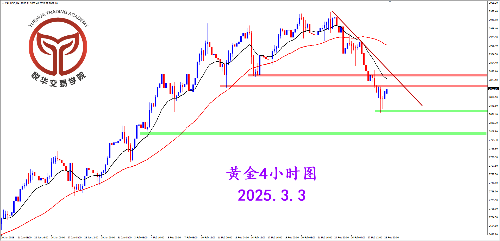 现货黄金4小时图,这波空头下行空间不小,虽然行情现阶段有明显企稳反弹但上方还是面临关键2865.0一带的压制作用,密切关注该压力位置表现,经过充分调整后关注遇阻表现。