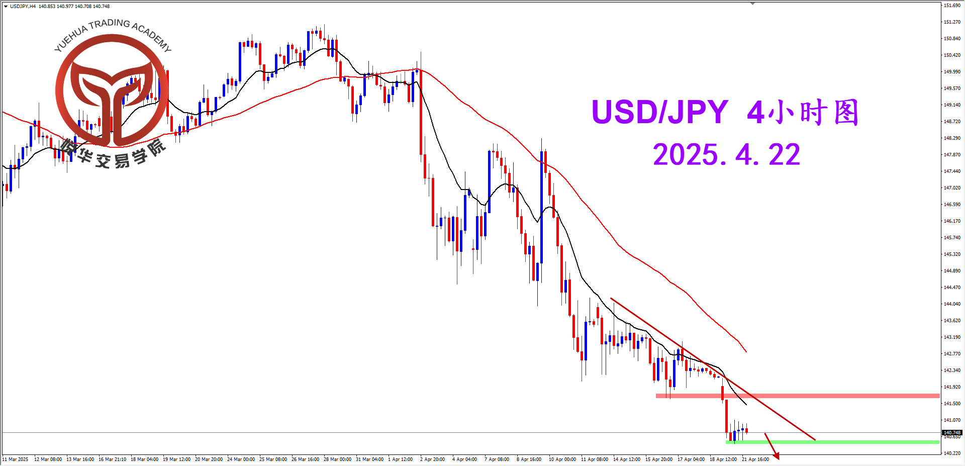 美日4小时图,行情经过横盘调整后再度破位向下运行,结合总体空头格局所以后市大概率还要下跌走弱,保持空头思路,寻求合理的空头形态。