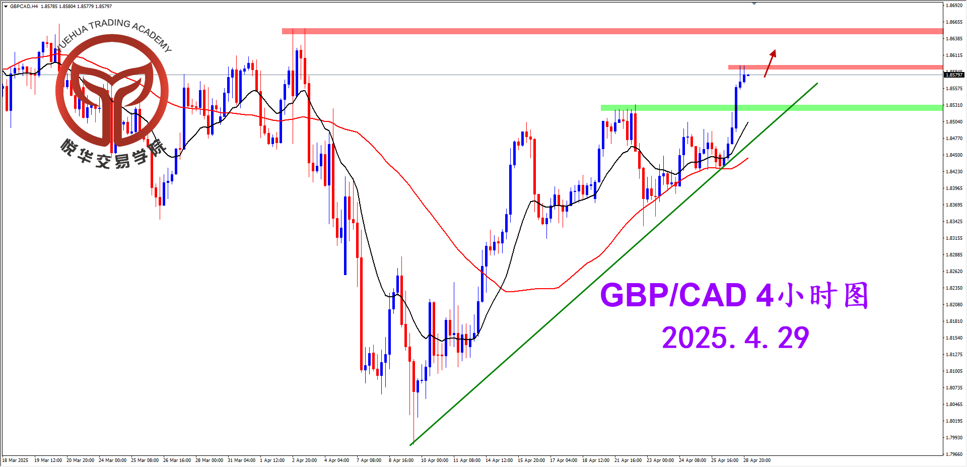 镑加4小时图,价格一路拉升走强突破关键压力位置,均线也开始发散多头排列,形式开始利多发展,关注多头合理形态。