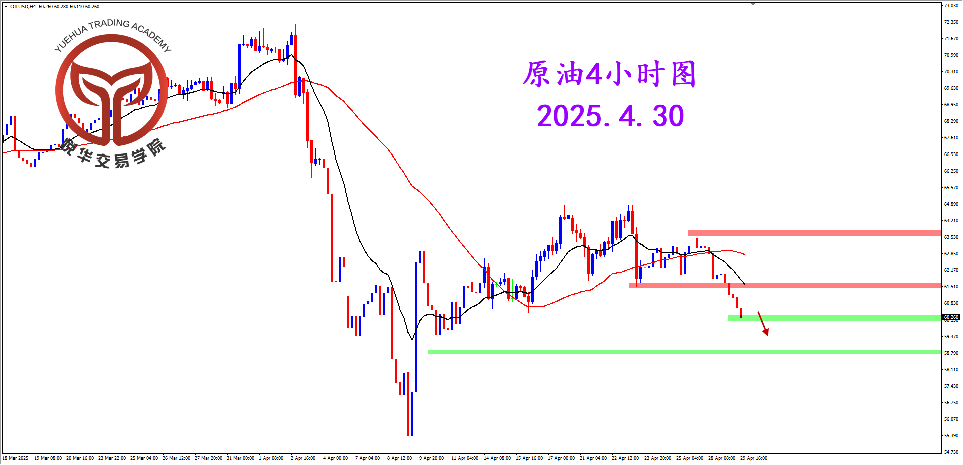 原油4小时图,行情经过复杂调整后跌破短期水平支撑再度走弱,新一轮空头有望启动下跌,空头方向较为明显,关注空头机会形态。