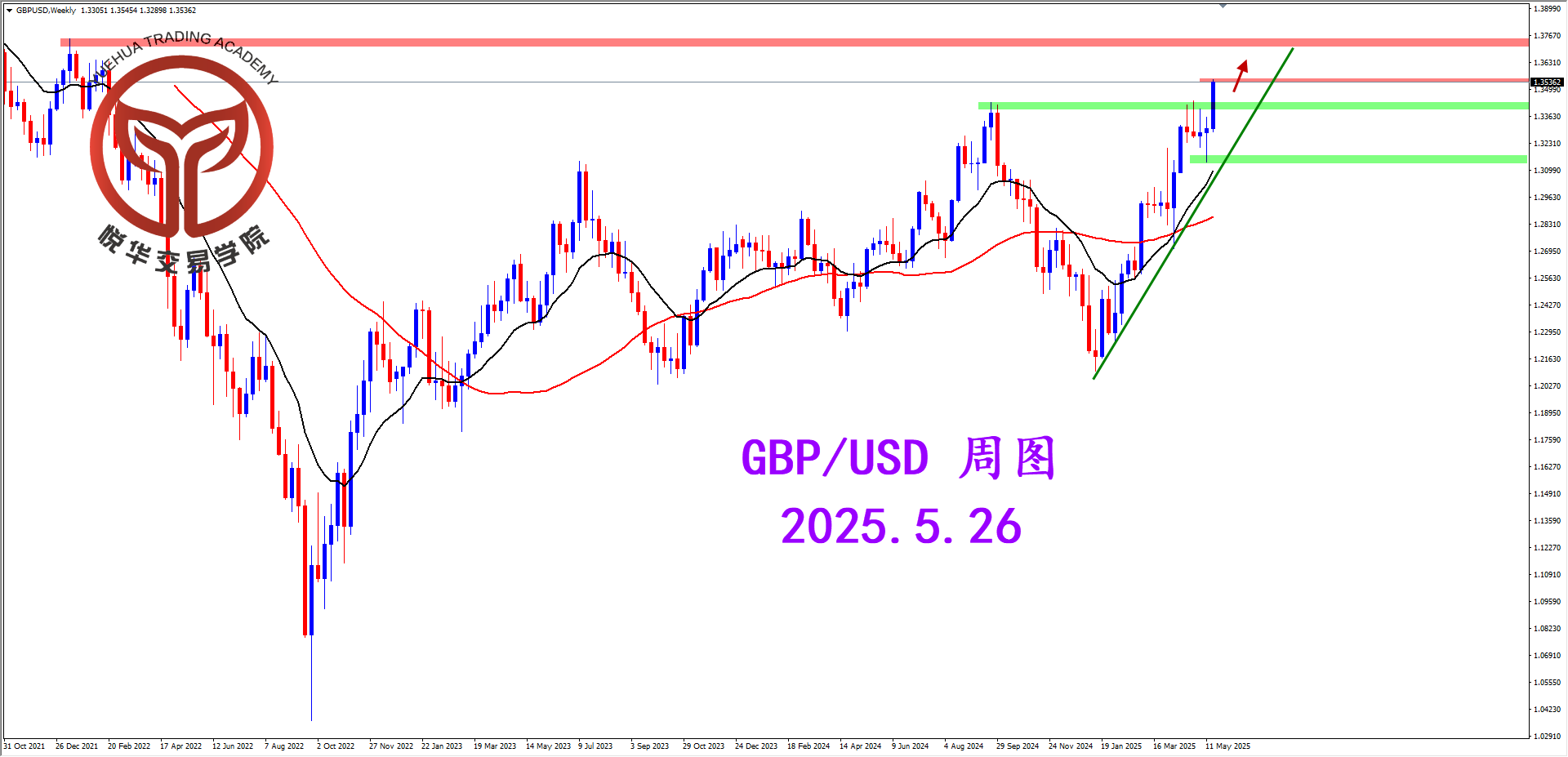 镑美周图,上周行情收出一根坚决大阳线,直接突破并且站稳上了关键水平压制1.3432,多头重新回归主导方向,目前形态下保持多头思路,关注继续拉升机会。