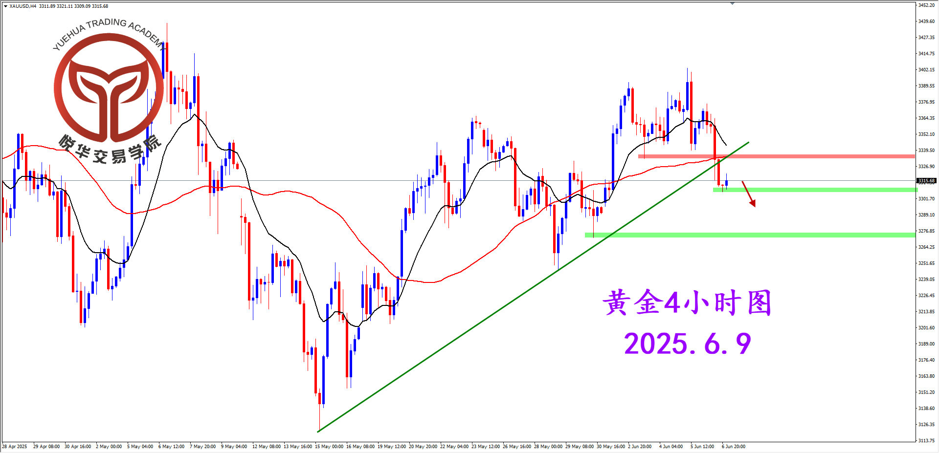 黄金4小时图,行情调整后坚决破位走弱,并且持续收弱阴线,奠定了短期空头基调,横盘头部调整后坚决破位直接走出完整的空头技术形态链,后市寻求做空的机会形态。
