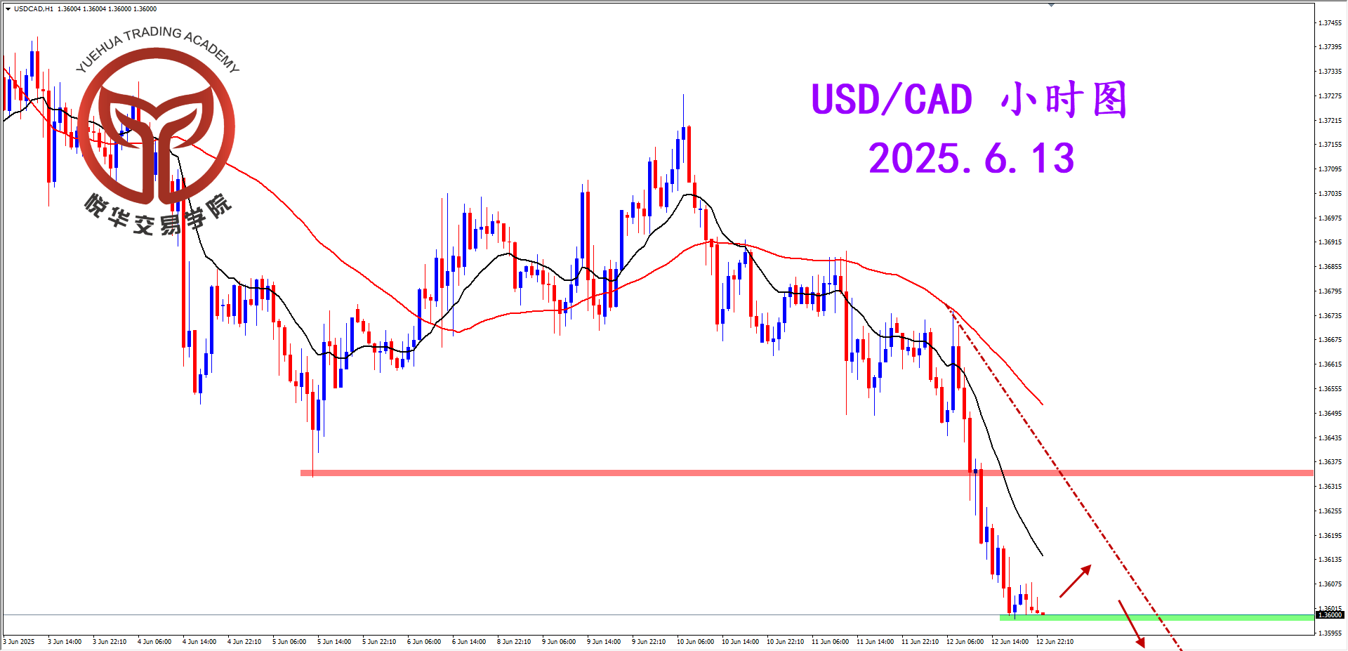 美加小时图,价格破位1.3634后一路下跌走弱,结束了长久的调整过程,目前在低位有调整需求,均线的压制有消息有待观察,尽量关注横盘调整后的蜡烛形态,关注合理空头机会。