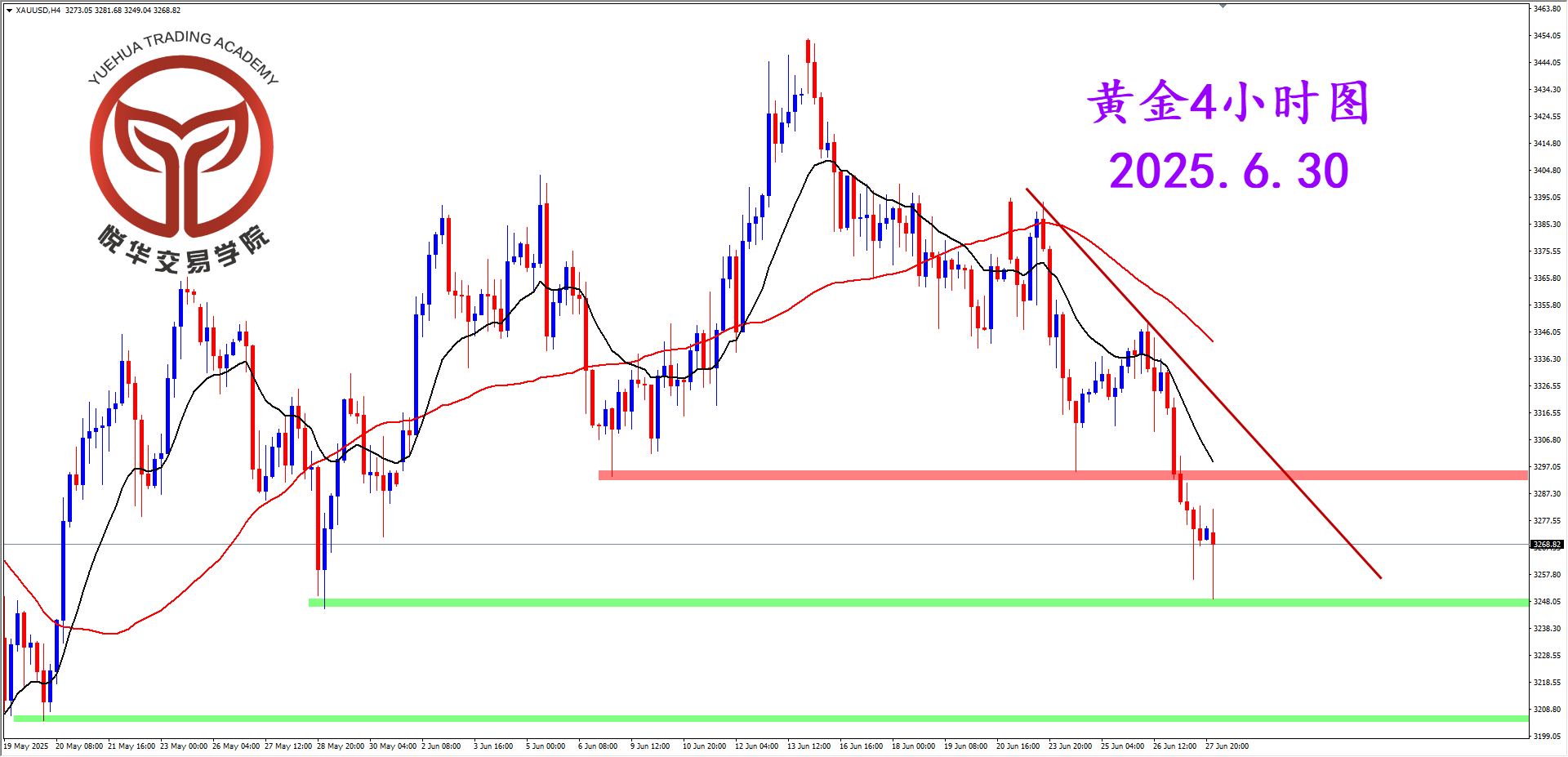 黄金4小时图,行情几段反弹后遇阻大幅走弱,跌破了关键支撑位置,下探到3256.2后企稳反弹,交易方向还是看空,等待合理的空头形态。