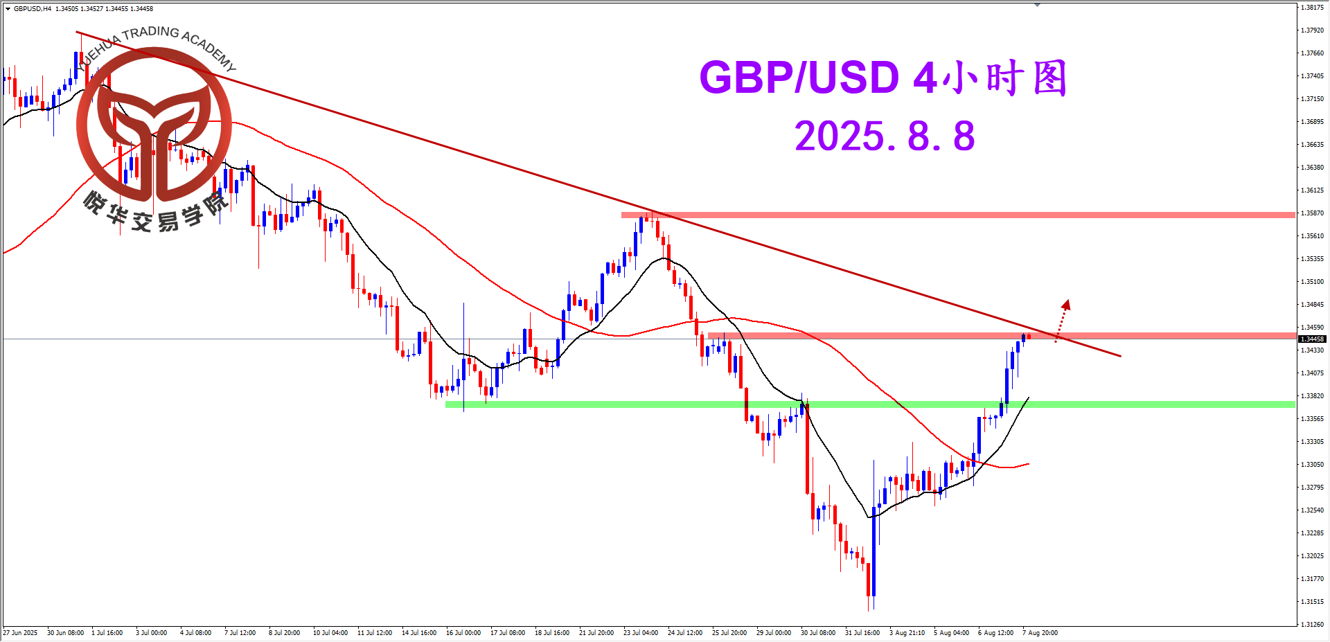 镑美4小时图,目前行情一路拉升走弱属于多头占据主导,只是目前面临关键压制作用,多头能否持续需要关注后市表现,不要在压力附近追高,等待合理形态。