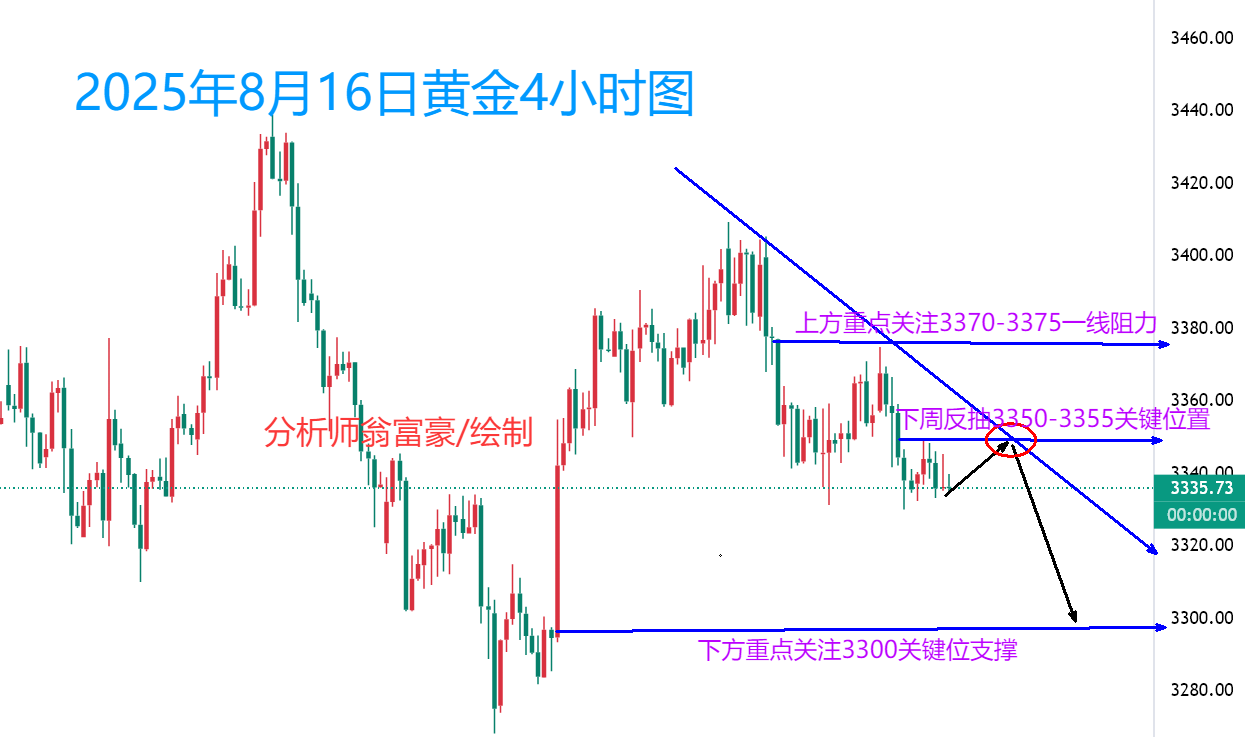 操作建议:下周黄金反弹3350-3355附近可考虑空单,止损3363,目标看向3320-3300