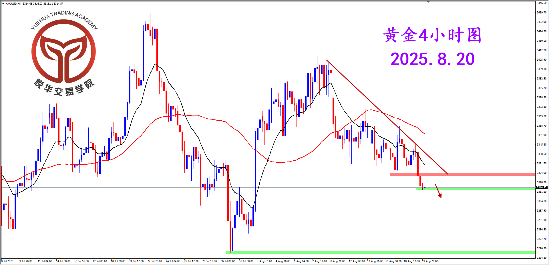 黄金4小时图,行情调整后坚决跌破了前期低点支撑作用,后市有望继续下行,并且均线也配合空头发展,至少短期有望走弱一段空间,密切关注高概率的空头形态。