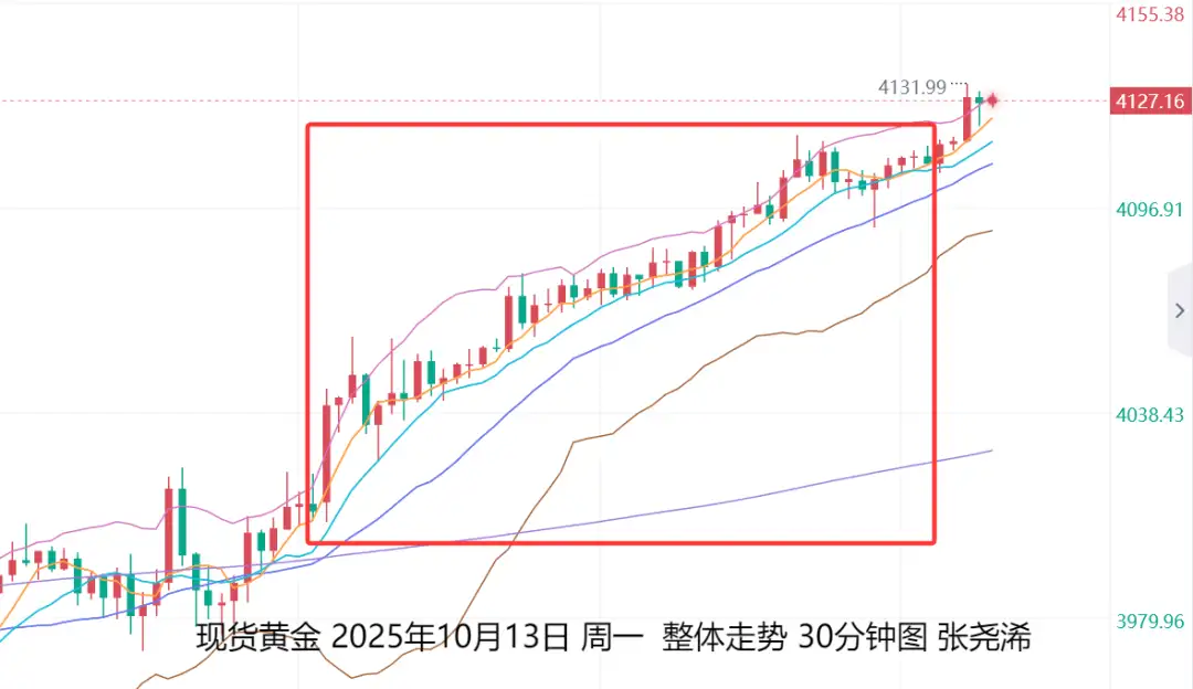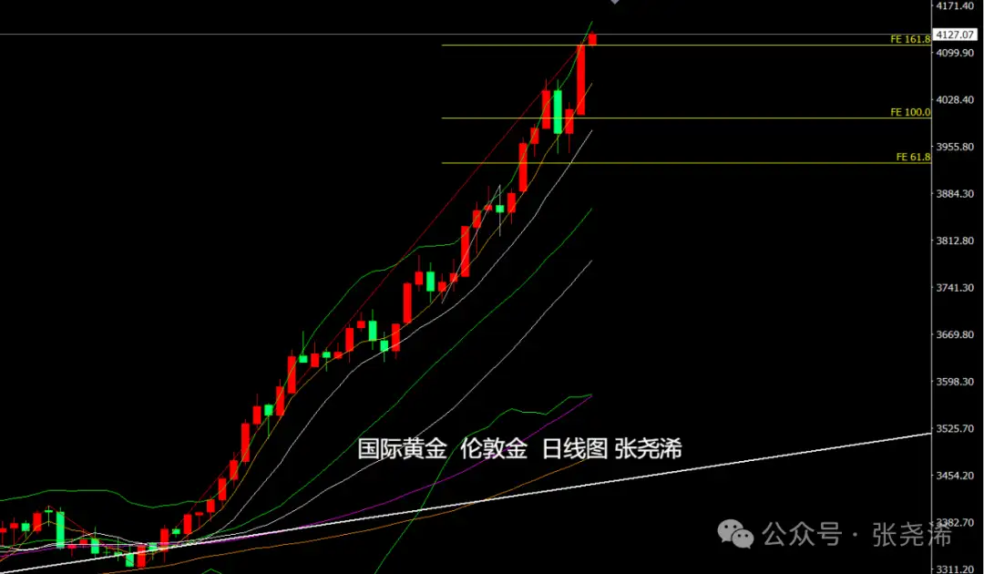 上交易日周一(10月13日):国际黄金强势拉升,再度刷新历史高点,如期触及给出的扩展线目标位4110美元,并持稳收阳,多头动力持稳,暗示后市将继续走强,等待触及7月份给出的看涨目标4200美元目标。