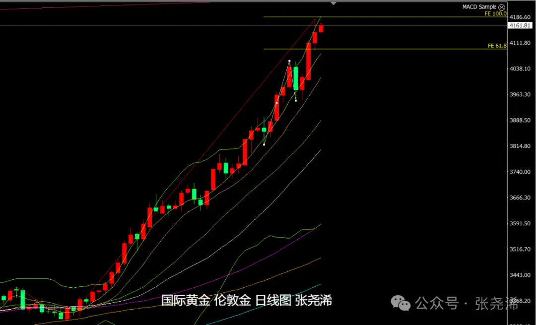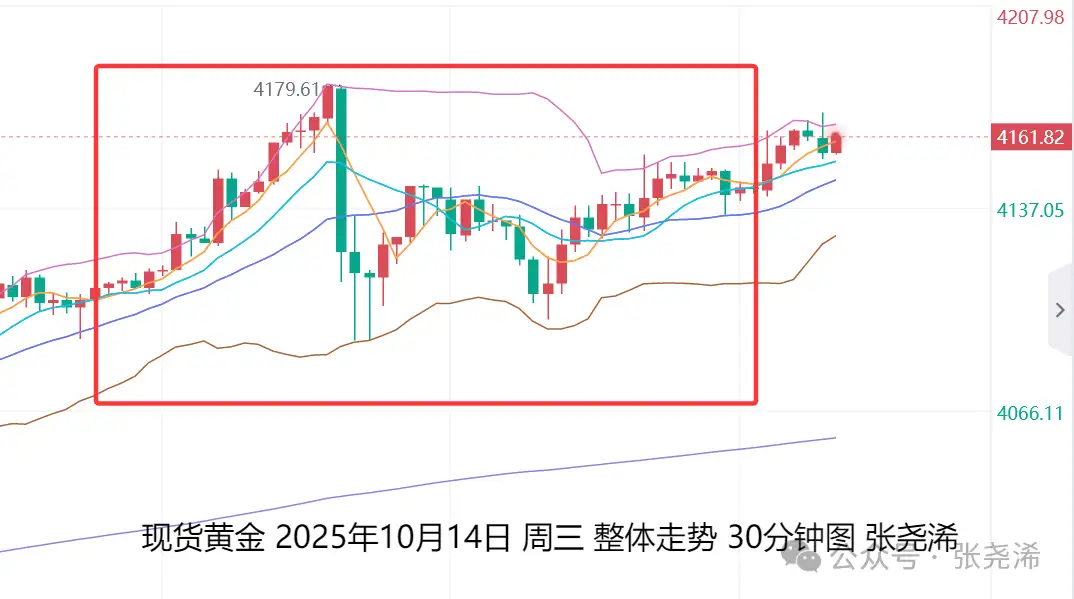 上交易日周二(10月14日):国际黄金震荡收涨,继续刷新历史高点,虽一度跳水转跌,但多头仍表现持稳,也未能跌破支撑,以及收取见顶形态,回踩支撑再度入场的多单也是获利颇丰,故此,后市来看,将继续保持看涨等待触及4200美元关口。