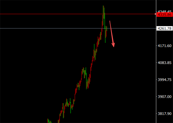 金价上周五在触及每盎司4300美元以上的纪录高位后回落,下挫逾2%,受美元走强和美国总统特朗普关税言论打压。这是黄金自3300一线上涨突破后迎来的最大盘中跌幅,且行情在高位暴跌,因此接下来行情在进一步突破4335一线之前,黄金总体保持高空思路,积极押注金价回撤。