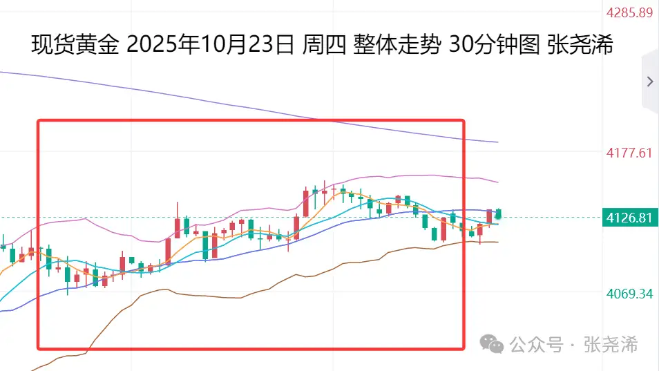 上交易日周四(10月23日):国际黄金震荡收涨,稳于布林带中轨支撑上方,暗示后市偏向震荡调整待回升的前景预期,不过目前仍未反弹至5-10日短期均线上方,周图走势有形成阴包阳或者十字反弹见顶形态,暗示后市仍有再度走低的倾向,但由于有降息周期支撑,以及技术看涨趋势良好,故此,如有进一步走低,下方10周均线支撑或者是30日均线支撑,也都是再度入场看涨的机会。