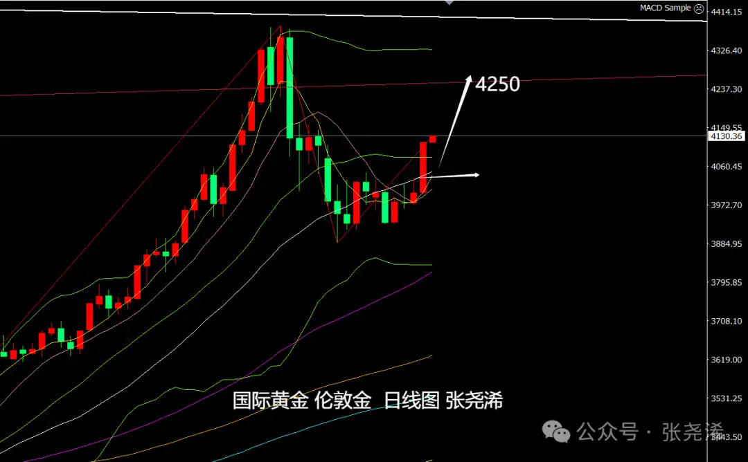 日图;金价昨日强势拉升,打破近期震荡格局,以及突破30日均线和中轨线阻力,方向转为看涨,下方将关注中轨及30日等均线支撑低多看涨为主,短期上方将等待触及4250美元附近目标。