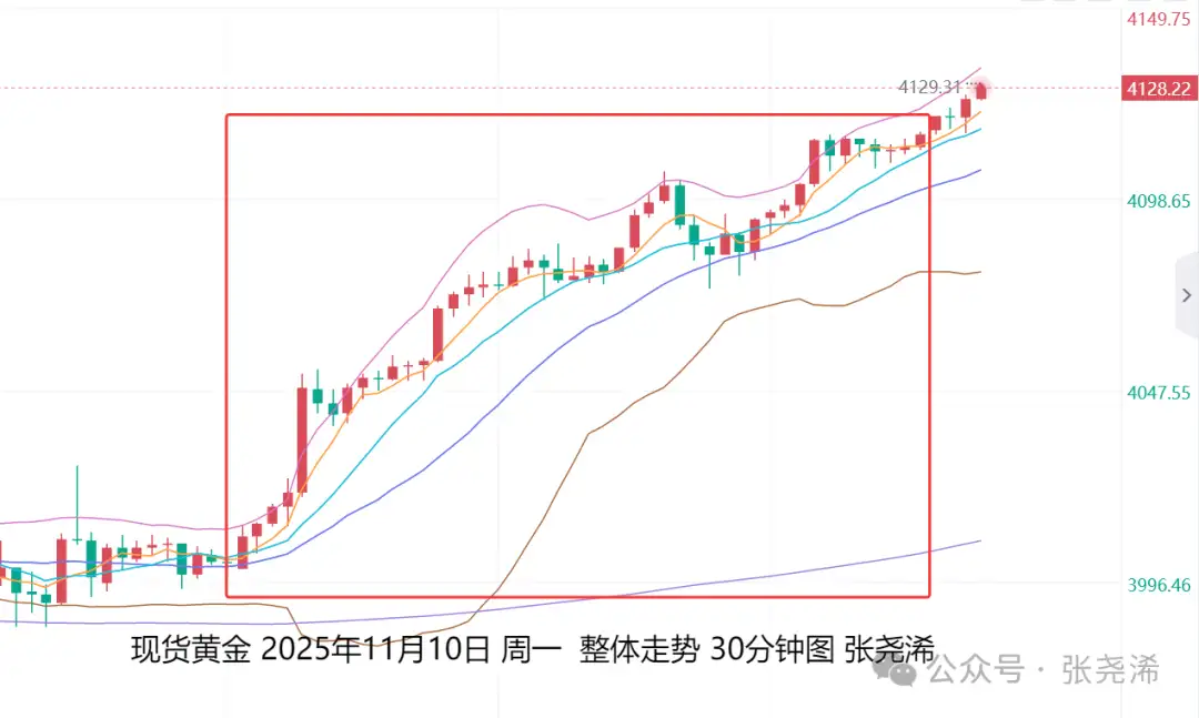 上交易日周一(11月10日):国际黄金强势反弹拉升,如期走出之前的看涨预期,并突破近期的震荡阻力30日均线,以及重回中轨线上方,阻力转支撑,多头力量加强,后市有望再度上探4300美元或更高位置。