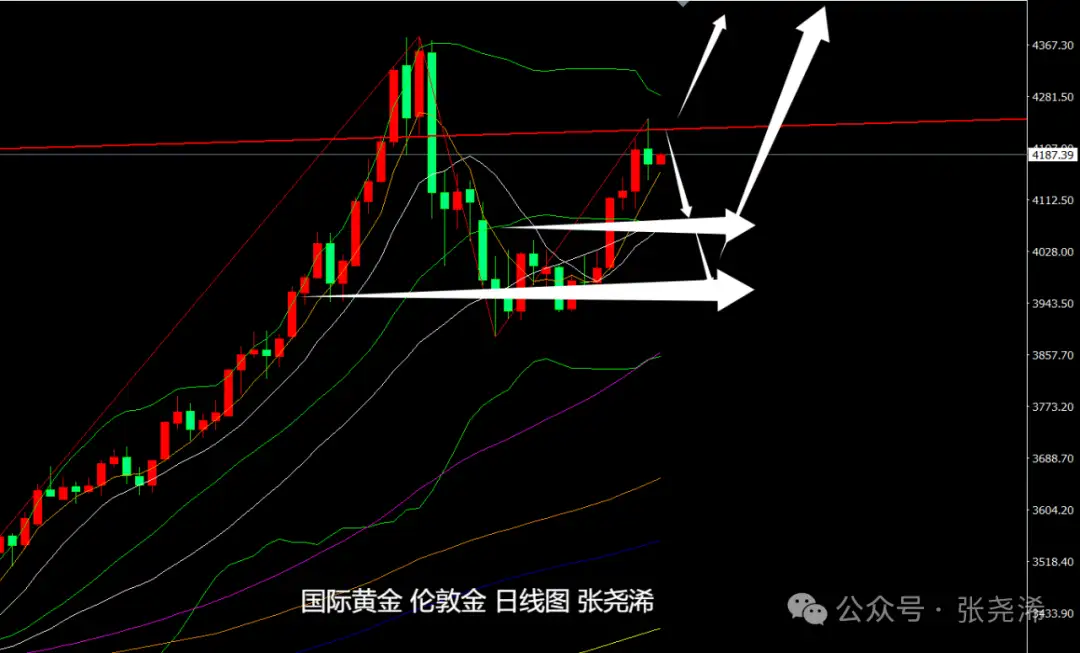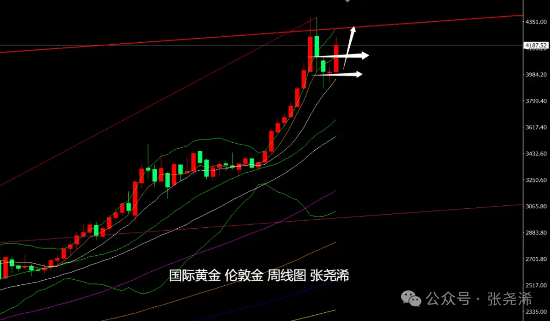 技术上,周线级别,金价本周受到上周的止跌形态和均线支撑看涨买盘等推动,表现走强,虽然目前多头动力减缓,但仍运行在5-10周均线上方,布林带也向上延伸,暗示看涨前景良好,下方关注均线支撑,仍可看涨上行,等待再度触及4300美元或新高。
