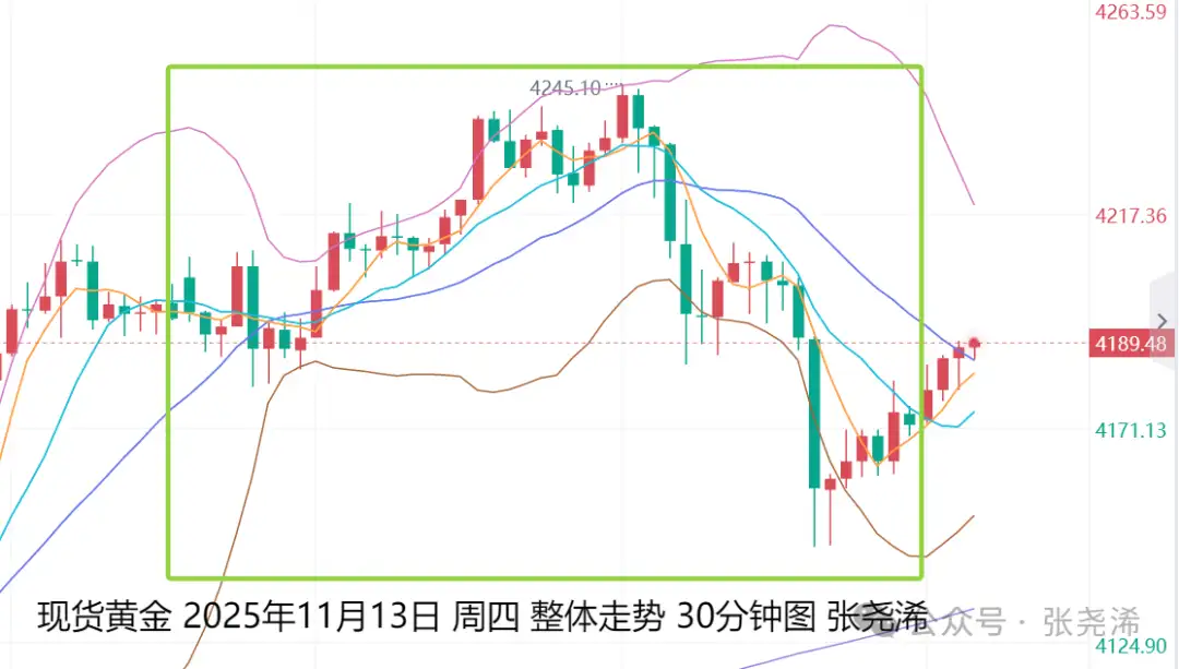 上交易日周四(11月13日):国际黄金遇阻给出的趋势线压力附近目标,以及美国结束史上最长停摆,诸多美联储官员再次释放偏鹰派信号产生利空,令其回落偏倒垂收跌,形态上也有一定的反弹见顶预期,暗示短期有回调至4090或4020美元附近的风险,但目前未跌破5日均线支撑,故此,暂先维持震荡或再度走强的预期对待。