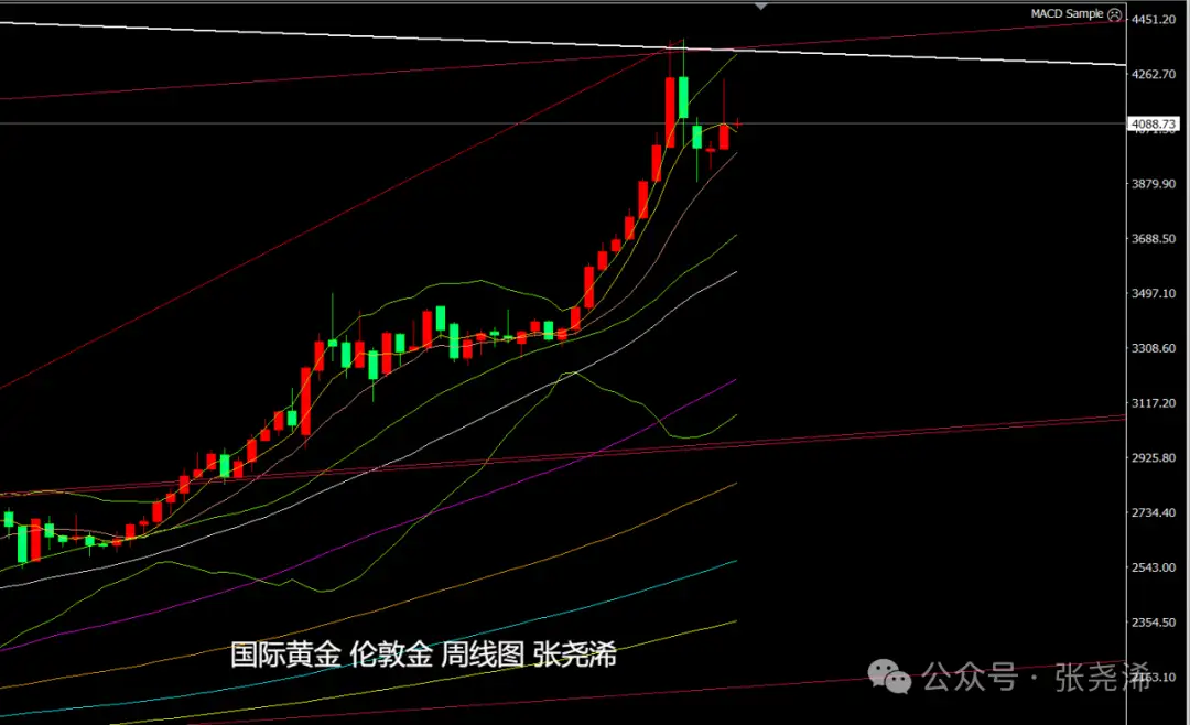 具体走势上,金价自周初开于4001.37美元/盎司,直接先行录得当周低点3997.70美元,随后则反弹走强拉升突破中轨阻力,但在周四录得当周高点4245.07美元,已经遇阻趋势线压力附近后,回落走低,并在周五加大走低力度,一度跌至中轨等支撑下方,最终动力有所减缓,收于4080.31美元,周振幅247.37美元,收涨78.94美元,涨幅1.97%。