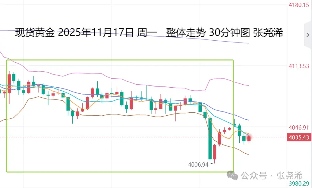 上交易日周一(11月17日):国际黄金触底回升式收跌,美联储“二把手”重申降息需谨慎等,令其12月降息概率大降,打压金价继续走低,虽由于支撑买盘,以及美联储理事沃勒支持12月降息,虽收线有一定的止跌看涨的预期形态,但指标信号也未显示出回落触底预期,并且当下利好因素减弱,本周数据等预期也偏向利空金价,故此,本周整体走势依然还是偏向震荡调整为主。